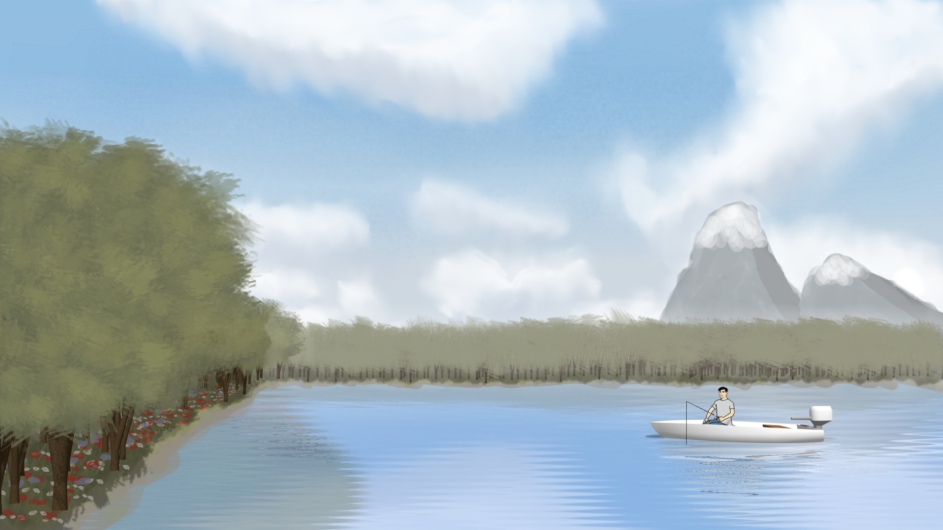 Горное озеро. Нарисовано левой рукой на графическом планшете Wacom. В графическом редакторе Krita.