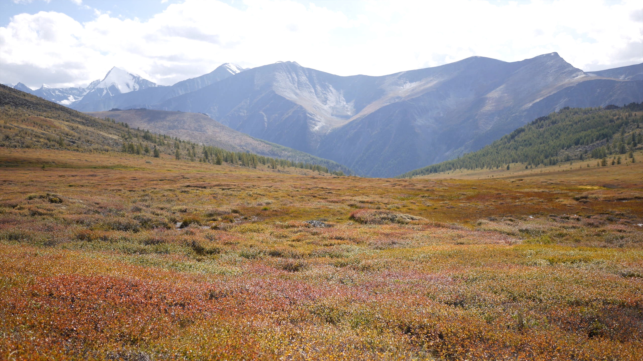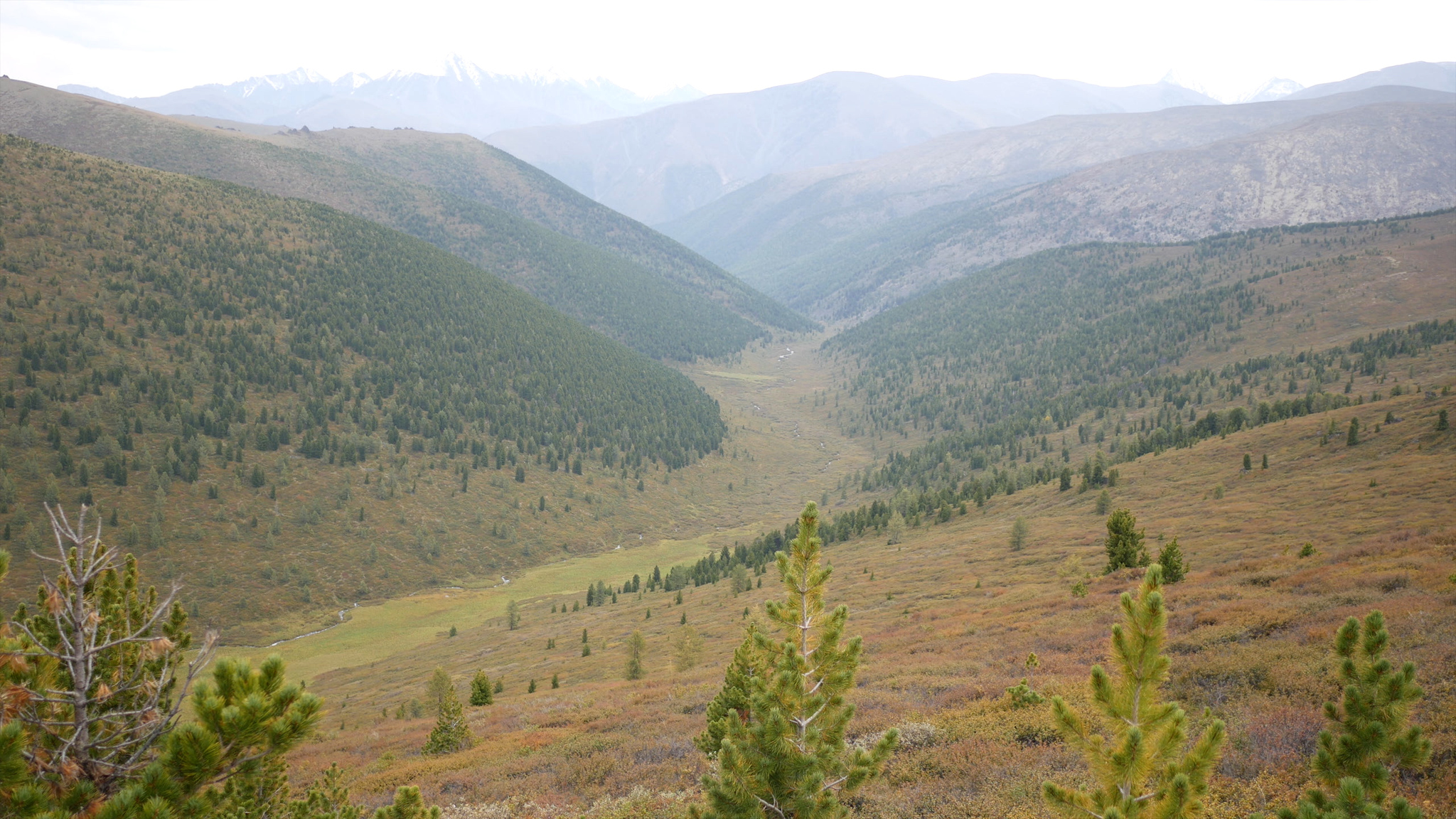Подъем от озера Гульдуайры не сложный, занимает пару часов. И затем тропа выходит на небольшое плато. Вот тут то мы и ушли с тропы (ее видно на фото ниже - тонкая линия вдоль леса).