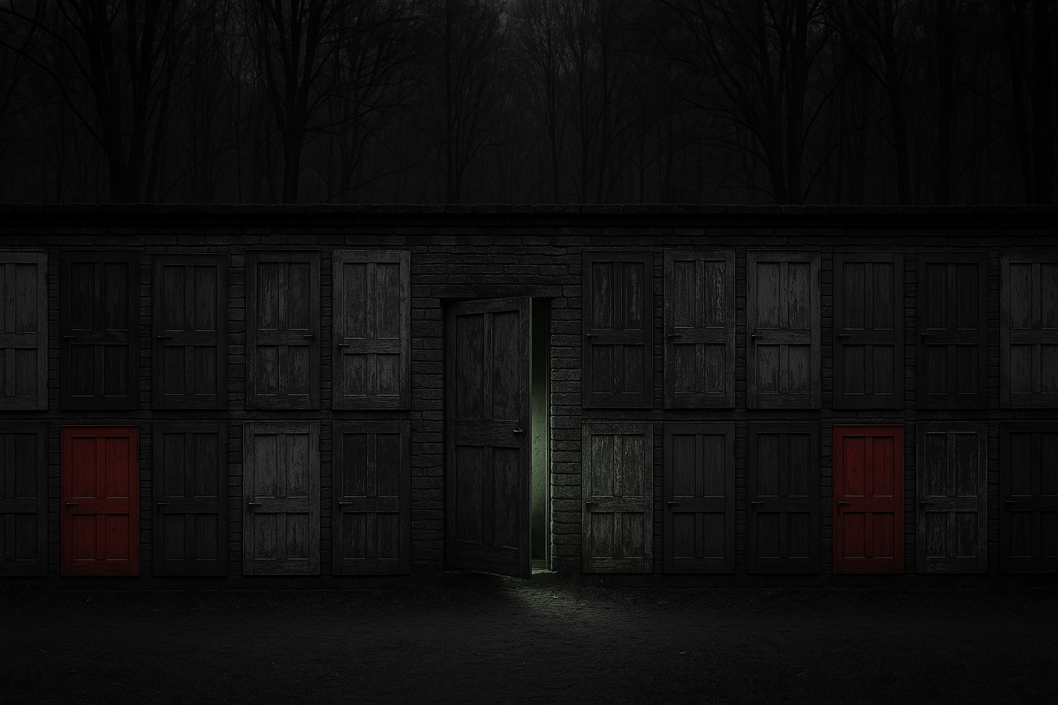 Стена выглядела жутко. Может, сотня или больше дверей, намертво вбитых в кирпич. Я попробовал подёргать за ручку – бесполезно.