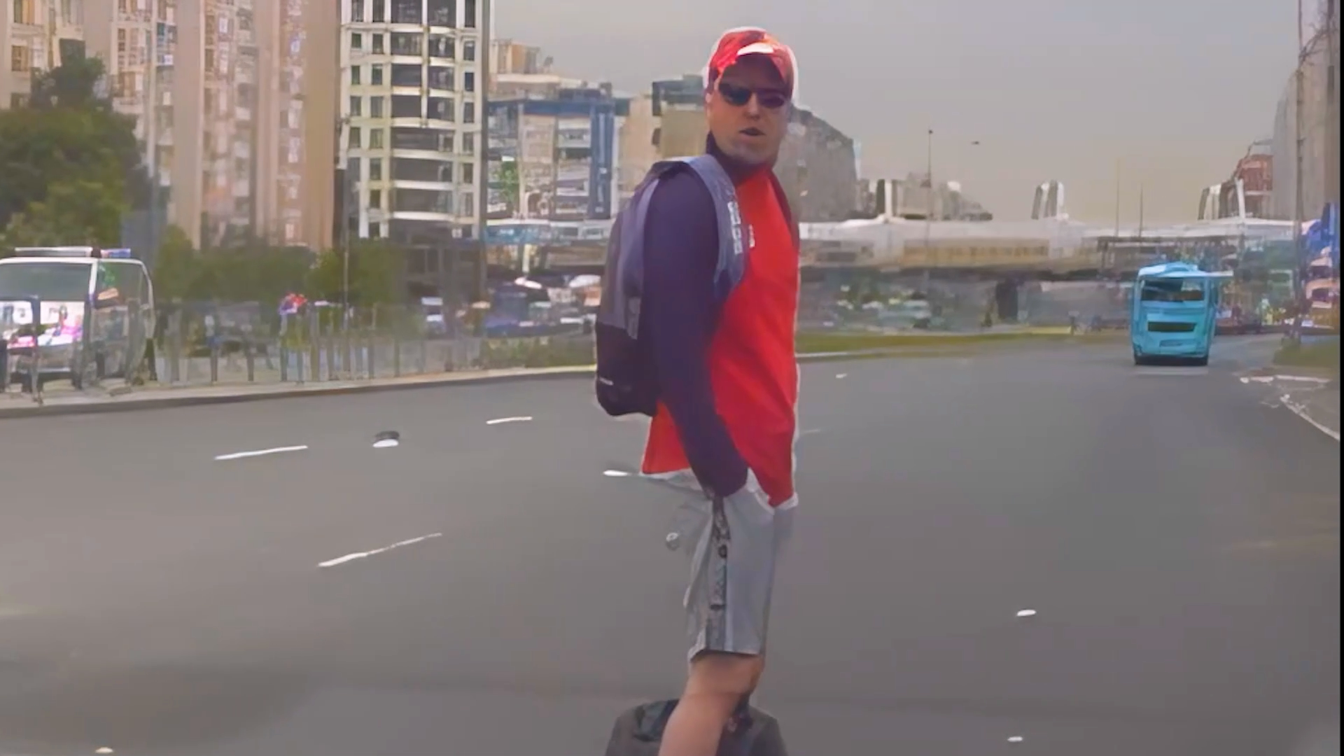 Очередной "герой" на моноколесе, дефилируя по пешеходнику, выражает свое недовольство и уверен в своей правоте. Показал ему знаками, мол, нужно ножками по пешеходнику то...Но куда там, показал неприличный жест и поспешил к своему бойфоенду по своим неотложным делам))