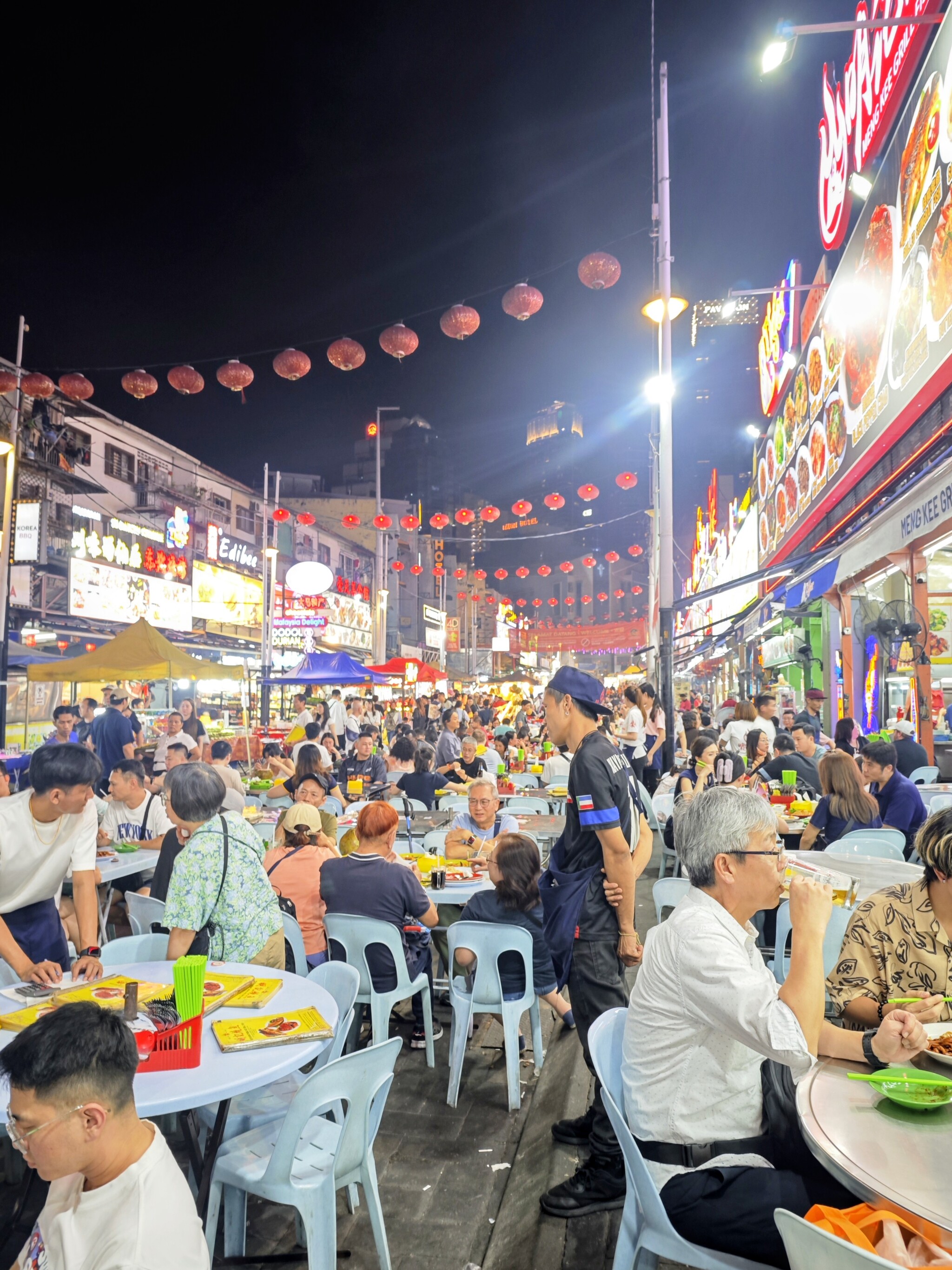 Атмосфера и вид тайского ночного рынка, но громче, шире, длиннее и разнообразнее. Первая линия прилавки с шашлыками, фруктами, морскими гадами и прочим, за ними стоят столики ресторанов. Зазывала открывают меню прямо в лица прохожих. Берём жареные пельмешки, шарики из краба, какие то штуки из теста с рисом, небольшую пянсе. Постепенно проходим улицу насквозь.