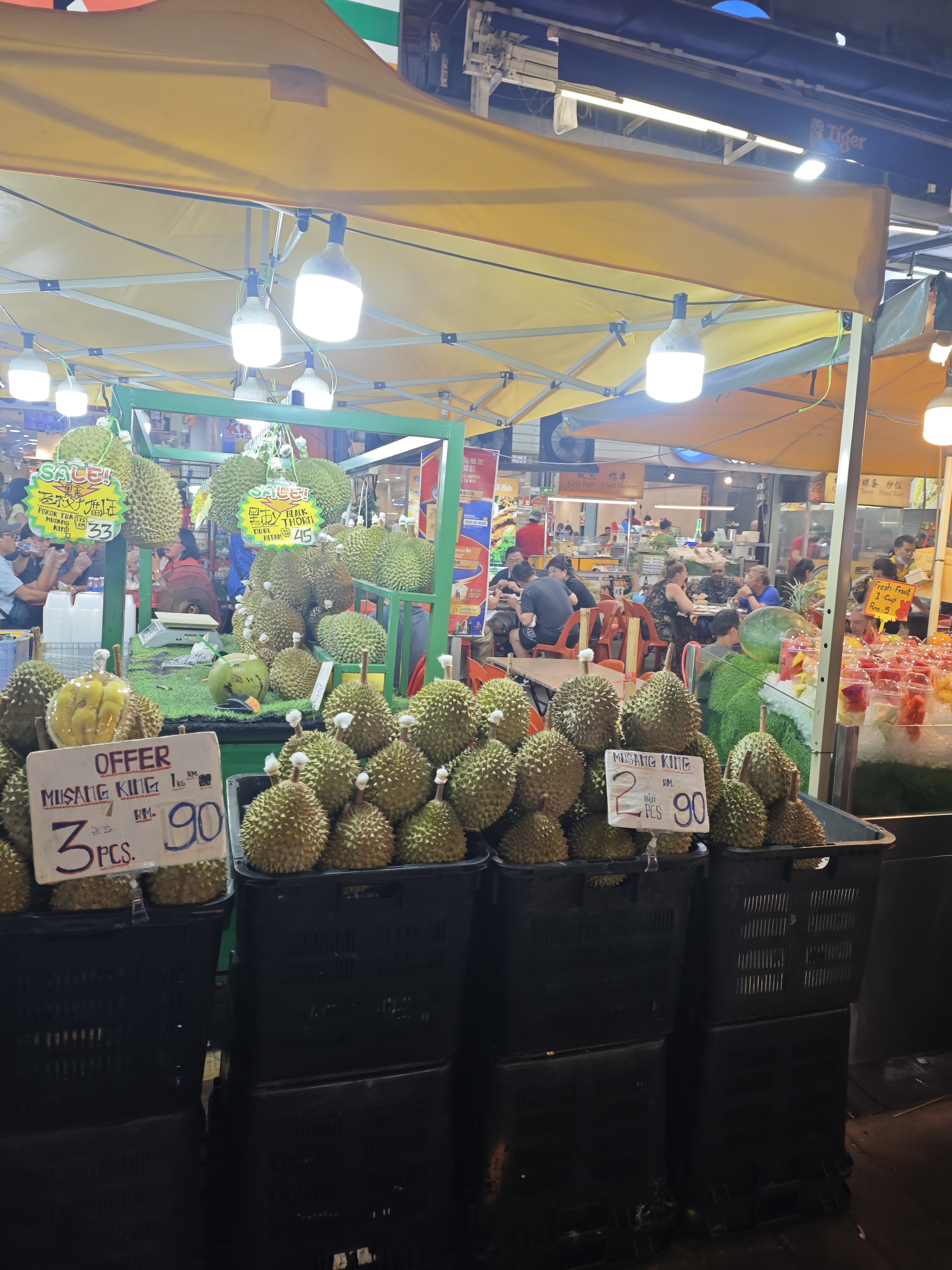 Выходим на улицу. Жарко. Прямо напротив выхода отеля 7-Eleven и прилавок с дурианом. Этот запах будет нас преследовать весь день. Но нам он, к счастью, не кажется отвратительным. Ларьки с дурианом сегодня мы будем видеть везде.