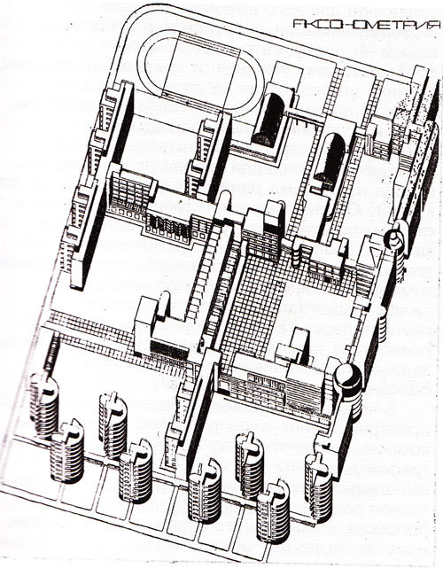 Тем самым, на смену тихому, почти пасторальному «городу-саду» начал приходить конструктивистский и навевающий холод для привыкших к малоэтажным домикам соцгород. Типичный дом-коммуна в соцгороде должен был быть соединен надземными переходами, расселялись в нем покомнатно. Естественно, по замыслам советских проектировщиков домов-коммун все это должно было работать как часы. Были и отдельные смелые решения. К примеру, идея томского архитектора-авангардиста Н.С. Кузьмина (1905-1985). Его дипломный проект Дома-коммуны Анжеро-Сундженских горняков (см. фото) был в духе конца 1920-х – начала 1930-х годов. Но этот проект имел и свою «изюминку». Всё население коммуны разделялось на семь возрастных групп в соответствии с круговой диаграммой «графика жизни». Для каждой возрастной группы с точностью до минуты было составлено расписание ежедневных занятий. Но мы не об этом. Самым смелым решением было создание «будок для уединения», где коммунар и коммунарка должны были «справлять интимную нужду», что было оценено советским руководством как «левацкий загиб».