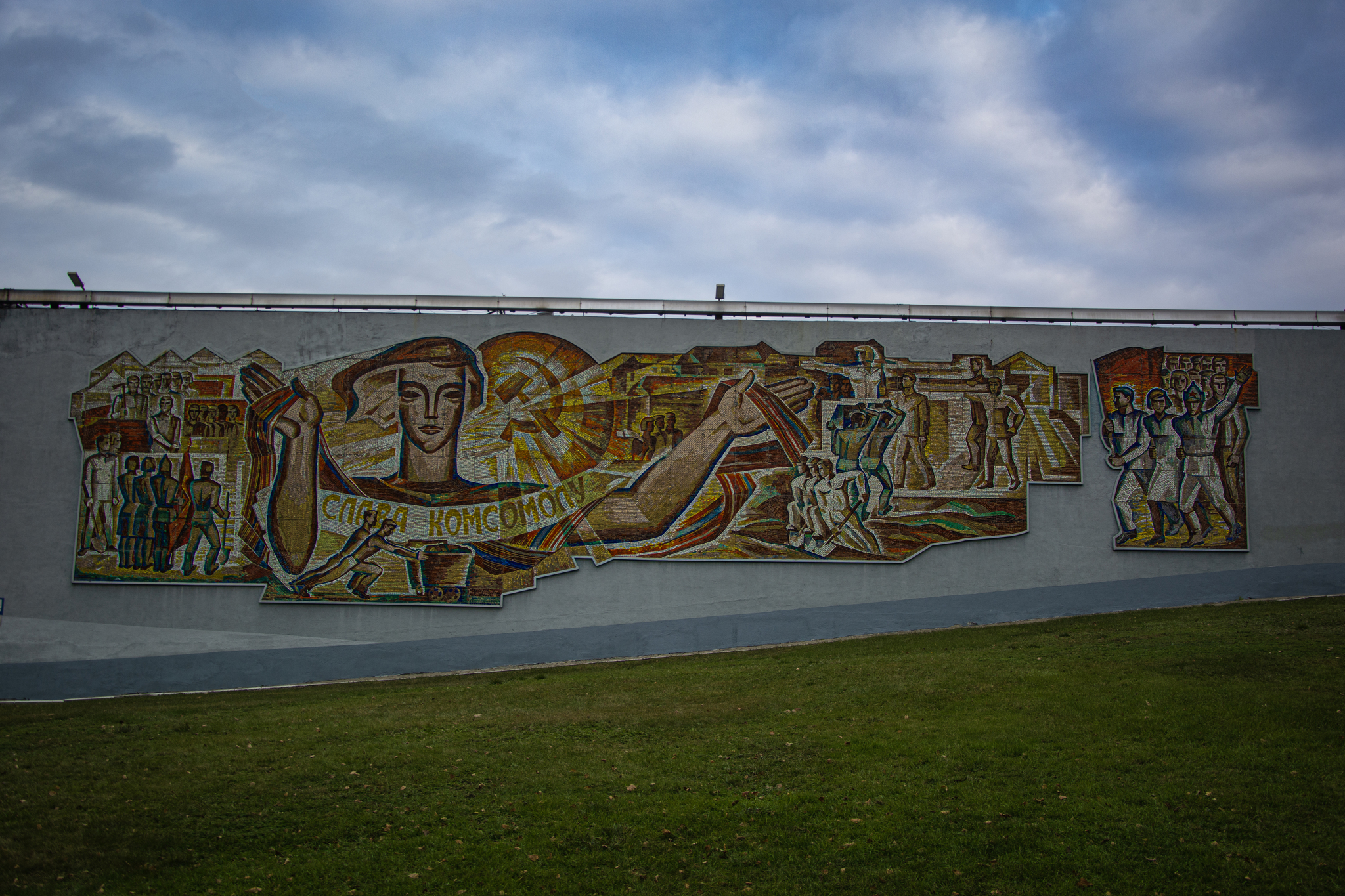 Дальше направились в музей и потом смотреть город, начали с интересных зданий и памятников, вышли на набережную города, она ремонтируется, там находится памятник первостроителям. Панельные микрорайоны просто привлекали мой взор, на одном здании была картина с кораблем, очень эффектно.