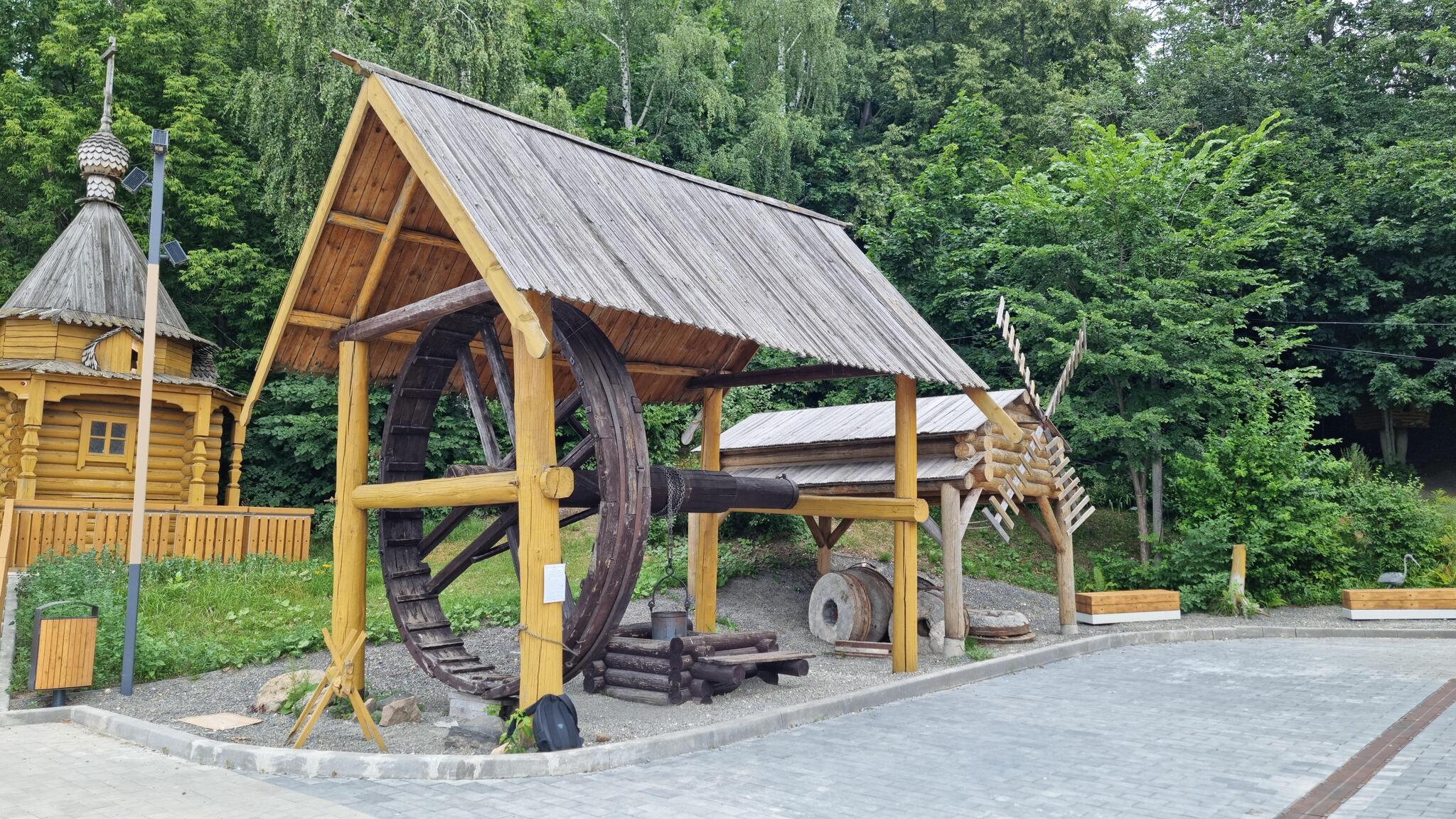Обойдя здание, я увидел колодец со ступальным колесом — механизмом, напоминающем огромное колесо для хомяка, приводимым в действие человеком или тягловым животным, идущим внутри. Такие колёса создавались для поднятия воды с больших глубин, а также почти две тысячи лет использовались в подъёмных кранах. Вот это технологии прошлого!