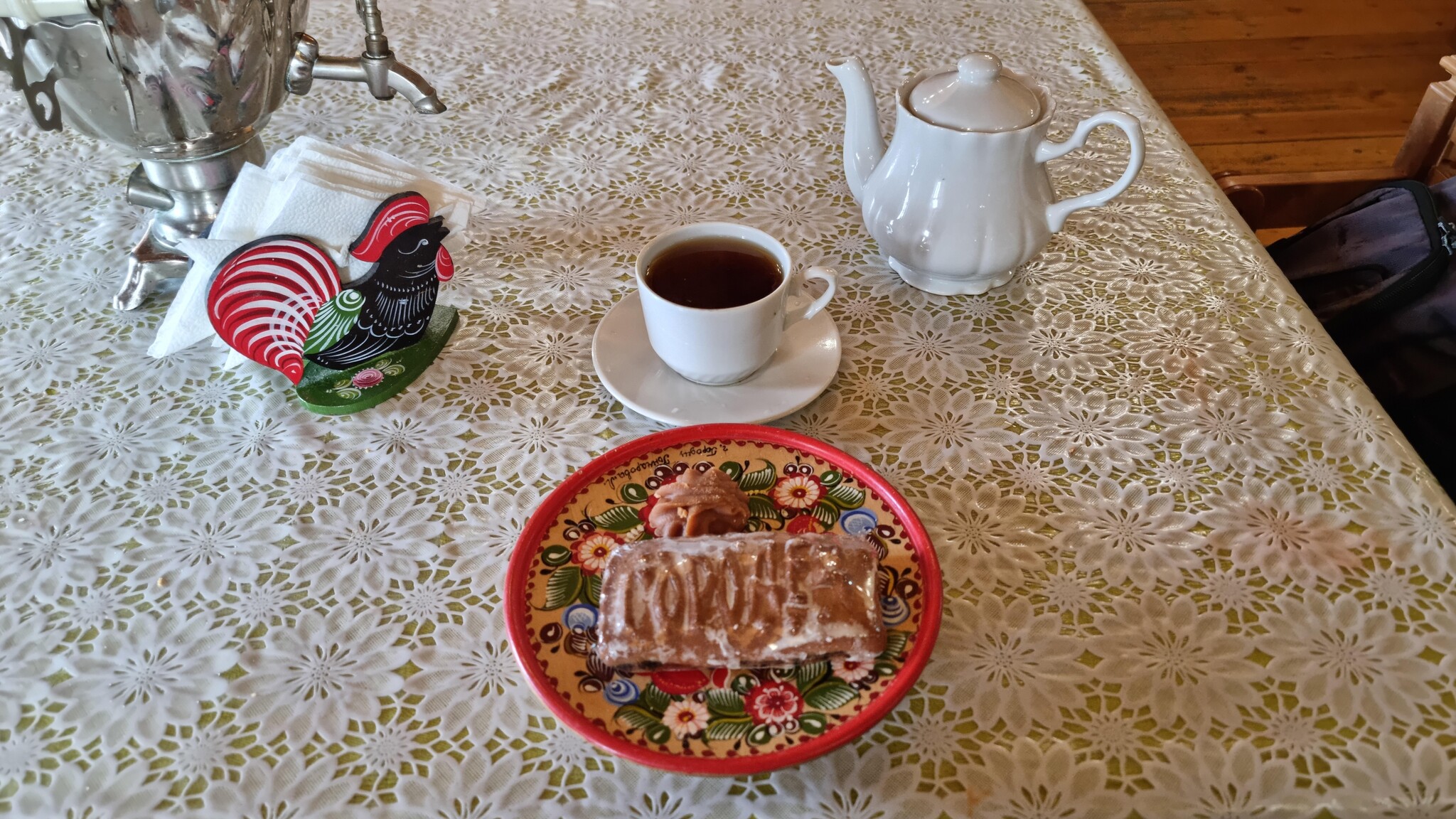 Закончив осмотр, я проследовал в небольшое кафе, находившееся внутри здания, и приобрёл билет на чаепитие. Оказалось, что Городец, помимо всего прочего, являлся крупнейшим пряничным центром Нижегородской губернии, и я обязательно должен был отведать данное лакомство, изготовленное по старинным рецептам. Как только устроился за столом, мне принесли печатный пряник с надписью “Городец” и чайник Иван-чая.