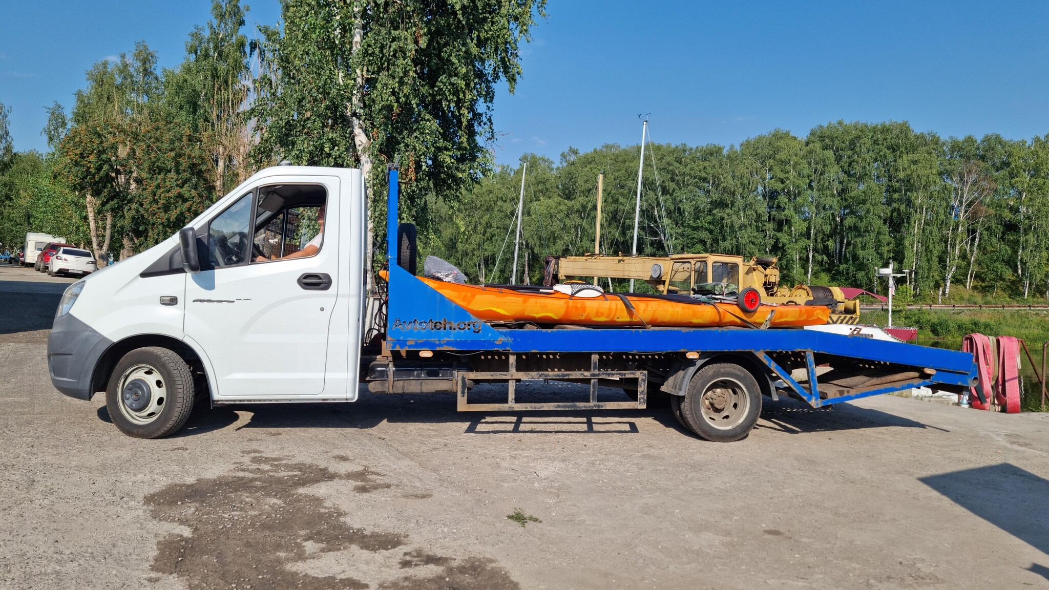 Примерно через двадцать минут эвакуатор заехал на территорию яхт-клуба, и из него вышел молодой парень, который представился Андреем. Подняв каяк на платформу, мы притянули его ремнями и отправились к месту назначения.