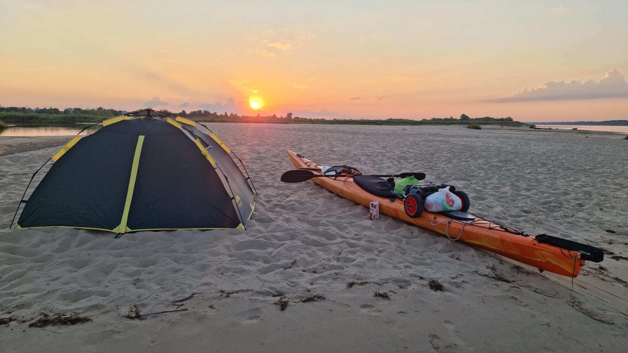 Через 15 километров от ГЭС по правому берегу показался огромный песчаный пляж. Время приближалось к восьми, и я решил, что настало время для отдыха. Вытащив каяк на берег, я поставил палатку, перенёс в неё нужные вещи. Поужинал, наблюдая за закатом и непрерывно снующими в обе стороны баржами, после чего занялся записями.