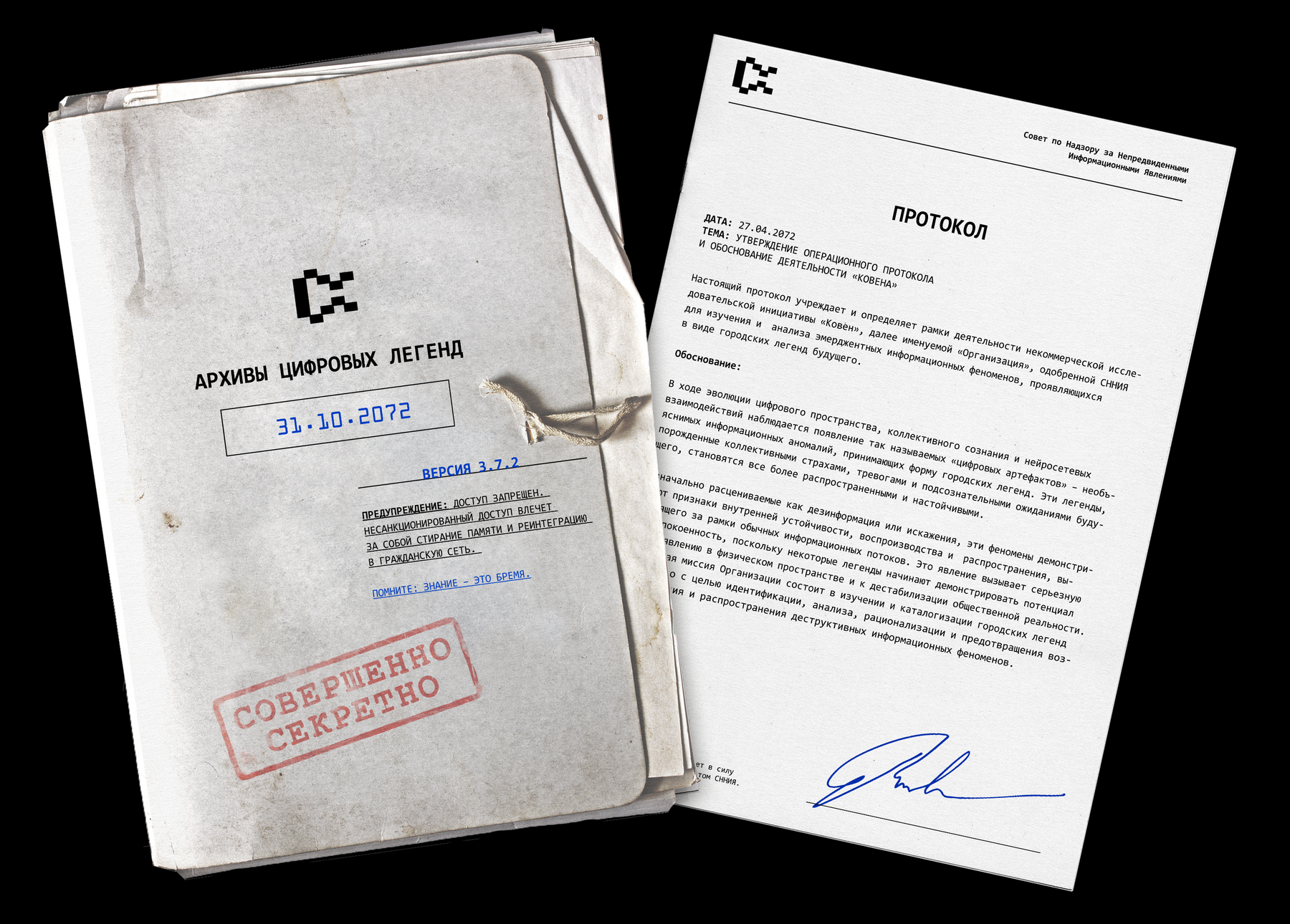 Я наугад пробирался между стеллажами, в поисках чего-то особенного, пока не наткнулся на толстую папку с надписью: «Ковен. Архивы цифровых легенд». Открыв её, я сразу понял — это не просто архивные документы. Здесь были отчёты, фотографии, схемы и даже карты города. Некоторые были испачканы засохшей кровью, на других — пометки, будто написанные не человеческой рукой: угловатые, рваные, словно кто-то спешил или не умел держать ручку.