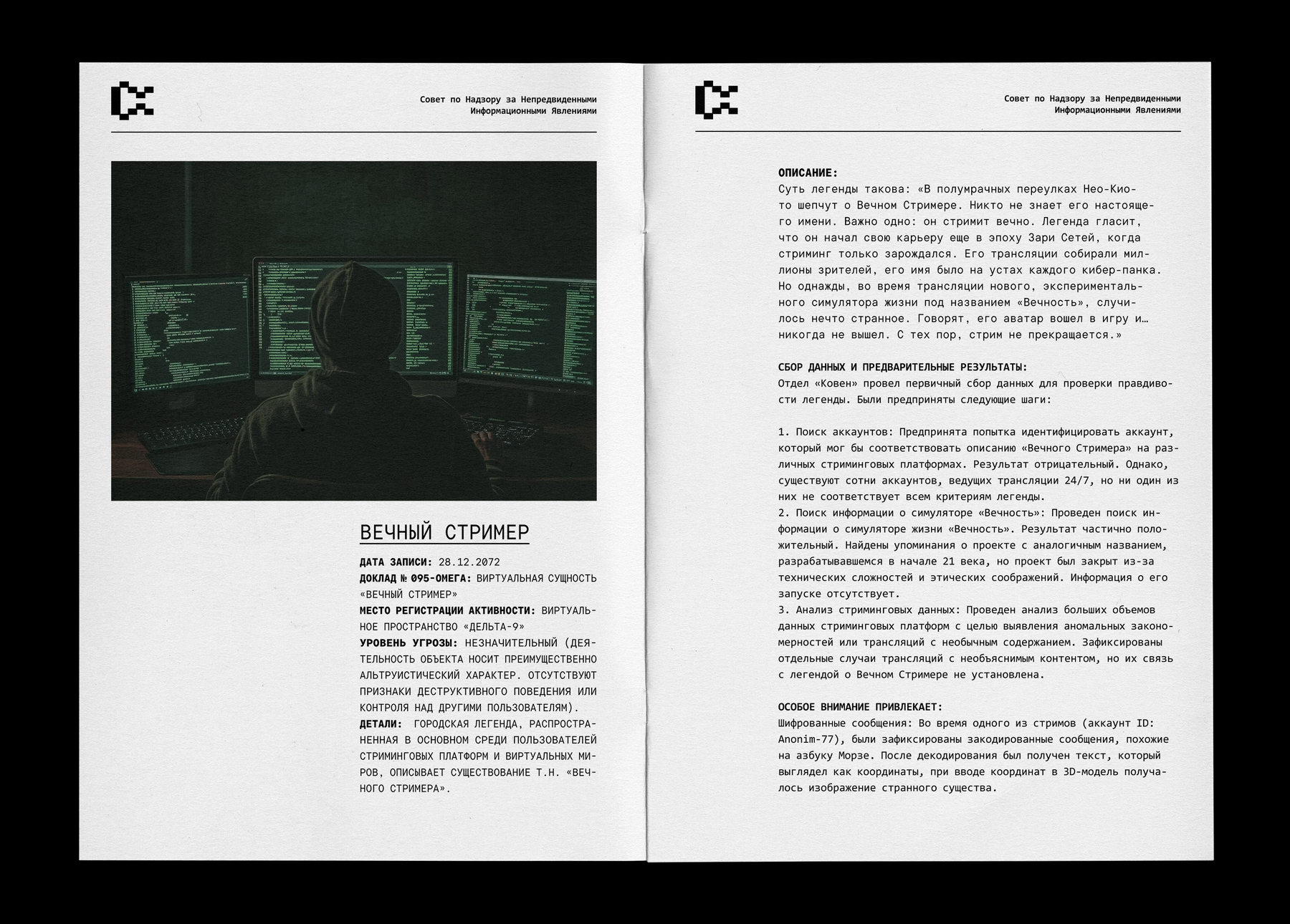 Дальше — досье на вечного стримера. Его описывали как человека, который не выключает трансляцию ни на минуту, даже когда спит. Записи утверждали, что он может предсказывать аномалии, а иногда и сам становится их причиной.