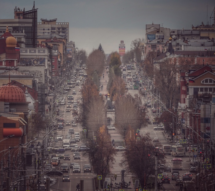 Нашел занятный ракурс на главный проспект нашего города, и сделал фото. Снимать пришлось с моста через Обь, на въезде в город. Кстати, мост в качестве места для съемки сильно разочаровал - несмотря на всю свою монументальность, его безбожно трясет от проходящих автомобилей, поэтому даже со штатива все шатало и смазывало. Пришлось задирать ISO чтобы сделать выдержку покороче.
