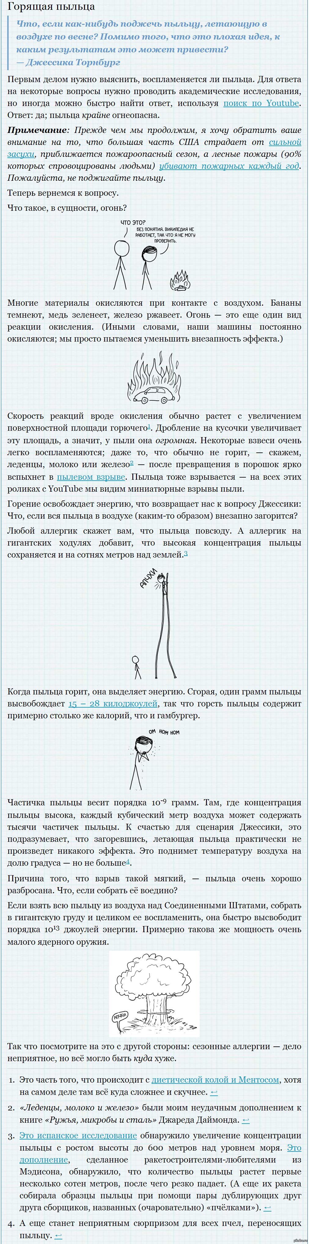 0 librarian Горящая пыльца 11 лет назад Что, если как-нибудь поджечь пыльцу, летающую в воздухе по весне? Помимо того, что это плохая идея, к каким результатам это может привести? [моё] XKCD А что если Длиннопост