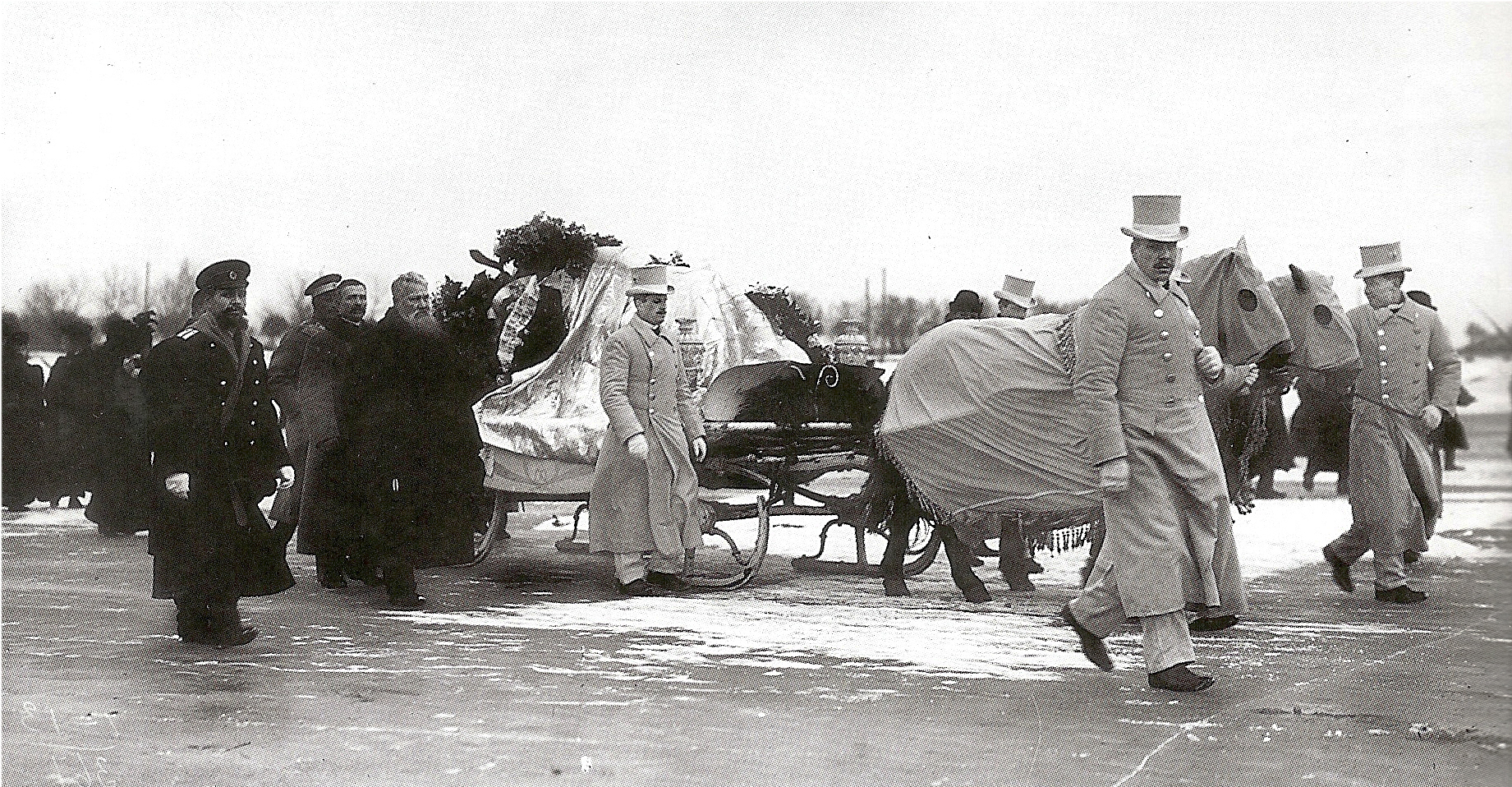 Похоронная процессия с гробом Иоанна Кронштадтского на льду Финского залива. 20 декабря 1908 года. Гроб с телом почившего батюшки с катафалка переставили на небольшие сани