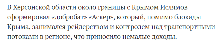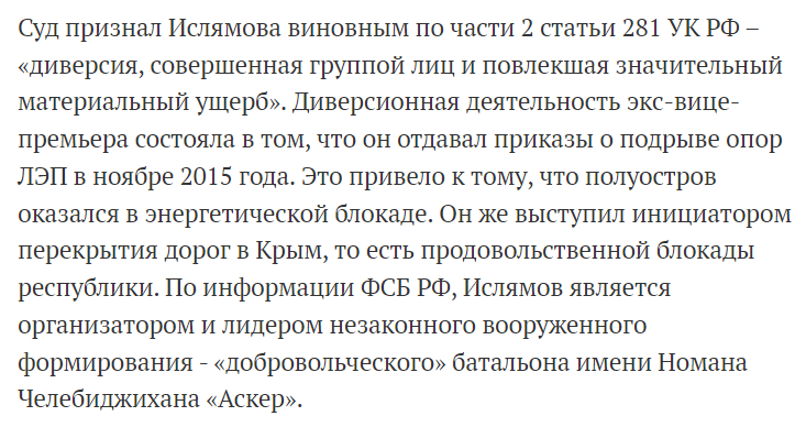 Кроме того, 26 июня 2016 г. Ислямовым была организована попытка диверсии в Керченском проливе: злоумышленники хотели разорвать паромное сообщение полуострова и материковой России.