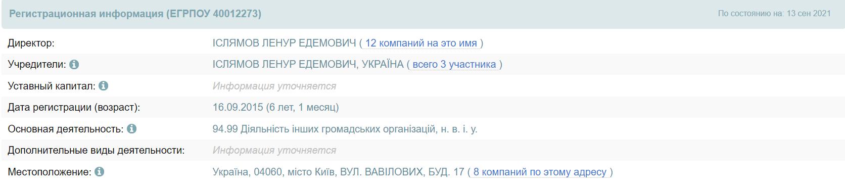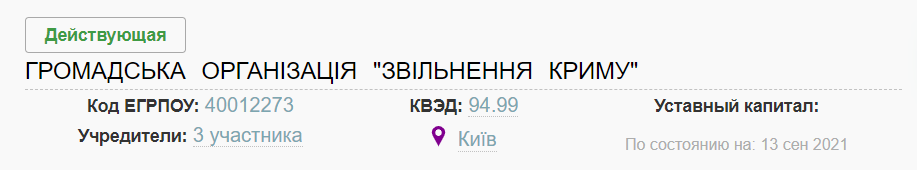 По данным сервисов проверки контрагентов, организация зарегистрирована в Киеве. Официальный статус – гражданская организация (ГО).