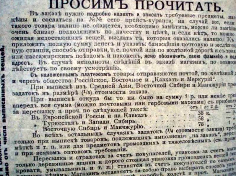 Покупки стоимостью свыше 75, а затем и 25 рублей высылались заказчику в любую точку России, причем расходы по доставке в пределах европейской части магазин принимал на себя. Четыре раза в год, к началу каждого сезона, издавались каталоги товаров, которые бесплатно рассылались всем желающим так же, как и образцы тканей.