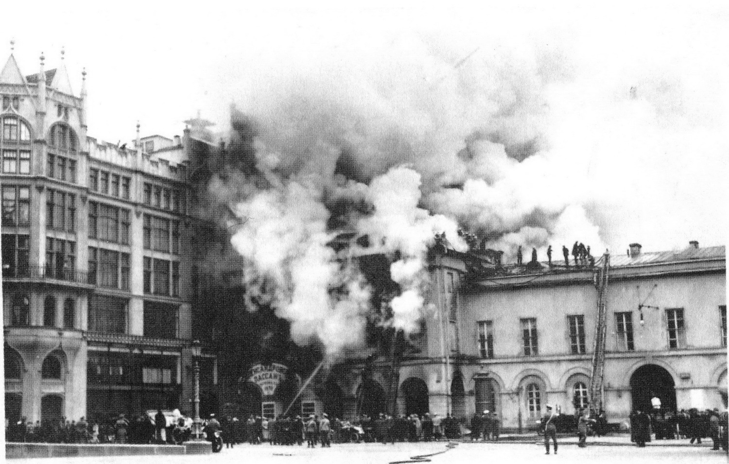 Выяснилось, что горел магазин «Мюр и Мерилиз» – теперешний ЦУМ. Черное небо как бы вздыхало огнем, стены домов, лица людей то вспыхивали, то угасали. Переулок заполнился «беженцами» и их разнообразным имуществом. Некоторые уже успели вытащить кое-какую мебель в переулок и сидели на стульях. Пожар разгорался, начался ветер, и со стороны «Мюр и Мерилиза» несло теплом, дымом и гарью. Когда ветер усилился, то в небо взлетели какие-то ярко горящие полотнища, как алые знамена, – это горели целые кипы материи, разворачиваясь от порывов ветра. Некоторые куски падали на землю поблизости от нас, и люди шарахались от них, а какие-то смельчаки бежали навстречу, надеясь, что авось не весь материал обгорел. Отец строго наказал нам, чтобы мы стояли на месте, а сам пошел по Петровке – на разведку. Вернувшись, сказал, что приехали пожарные части, пожар заливают, опасности уже нет и можно идти домой. Долго я не могла уснуть – от «красоты», вероятно, но, конечно, и от страха". В.Ходасевич