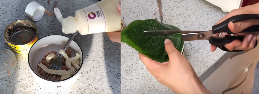 4.1 Можно взять банку тунца, слить масло и перемешать с небольшим количеством майонеза.