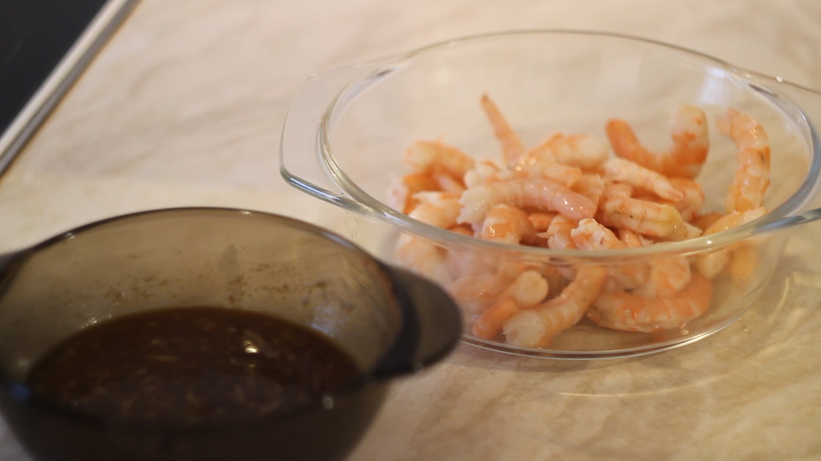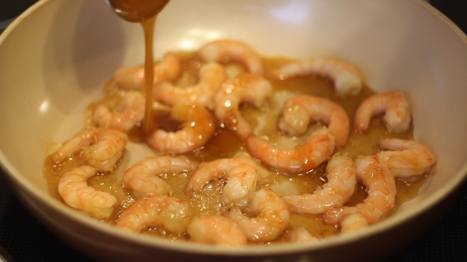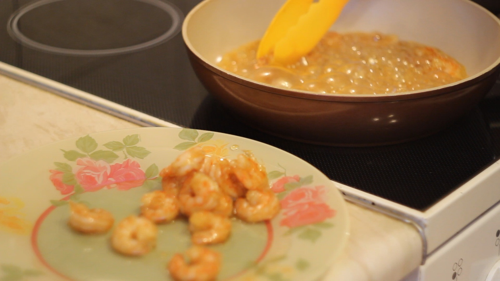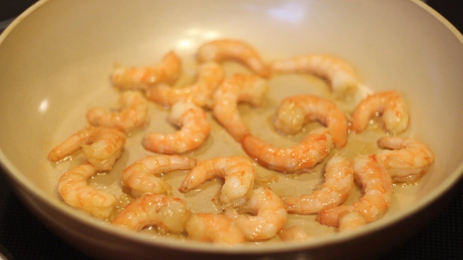 9. Выкладываем креветки на сковороду и обжариваем по одной минуте с каждой стороны.