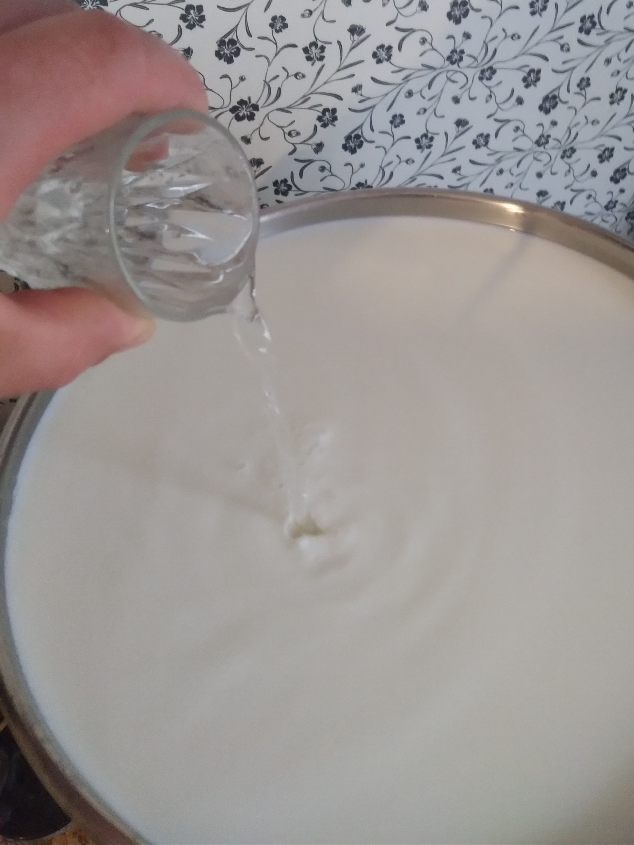 Сычужный фермент разводим в теплой воде,из расчёта 1/4 чайная ложка на 5 литров молока.Вливаем сычужный фермент в подогретое молоко и тщательно перемешиваем.
