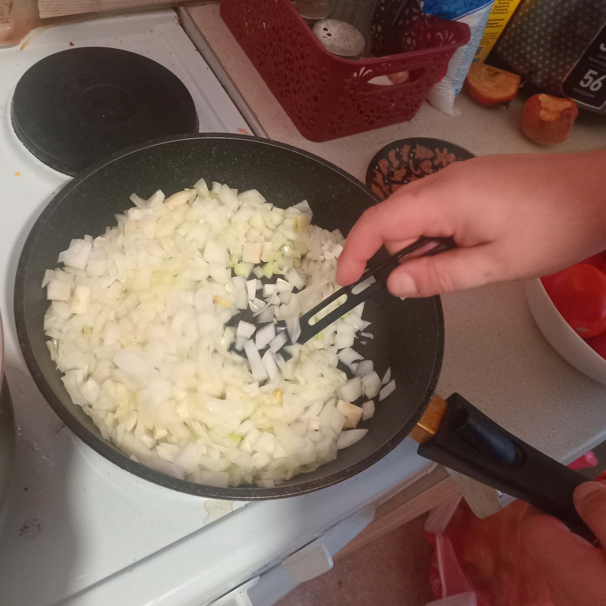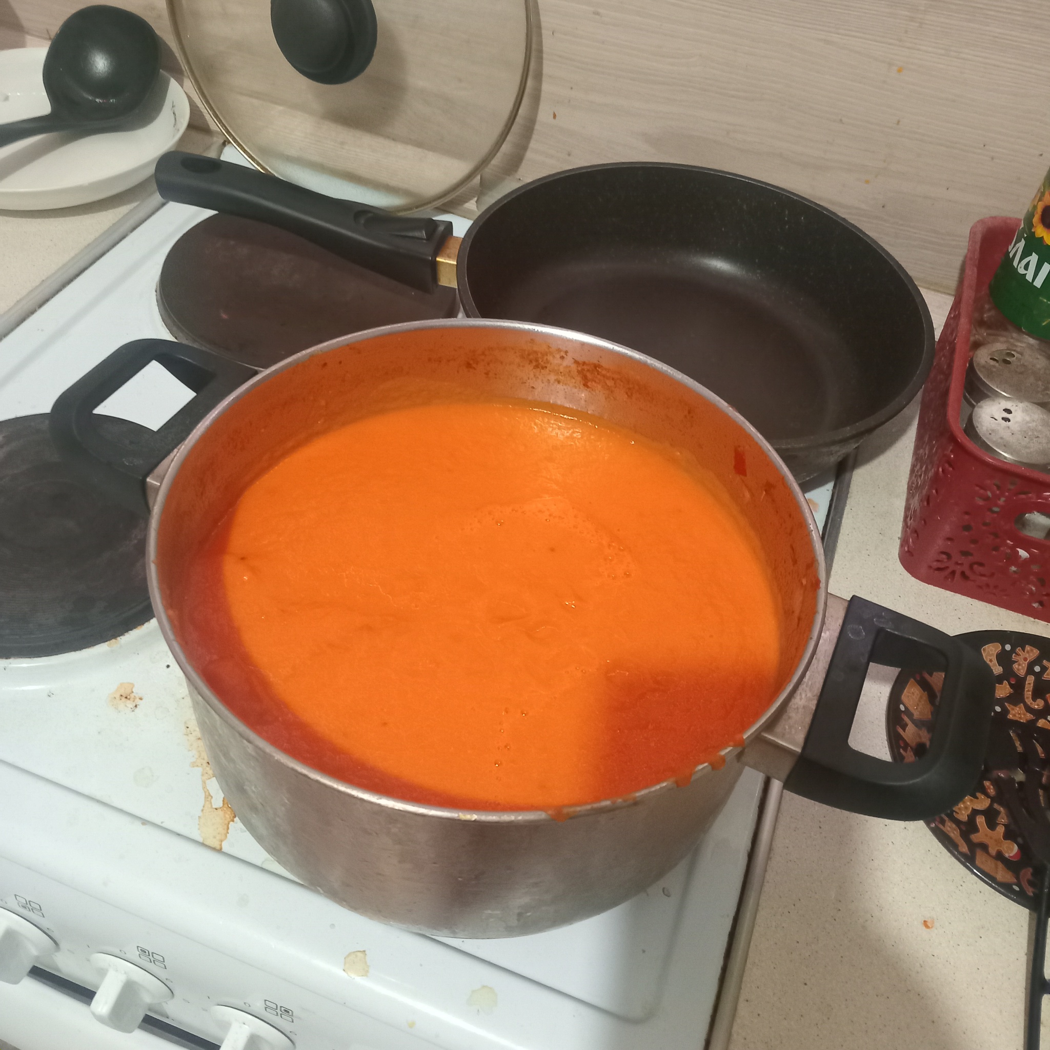 Засыпаем все это в бульон. Плюс два килограма помидор и блендерим. Не знаю есть и слово блендерим?