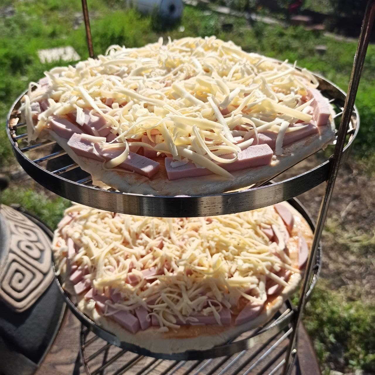 Буквально через 6-8 минут достаём. На видео на решетке только одна пицца, поскольку со среднего ряда мы сняли через 6 минут готовки, а верхнюю решили оставить ещё на 2 минуты (сверху у тандыра обычно меньше всего жара)