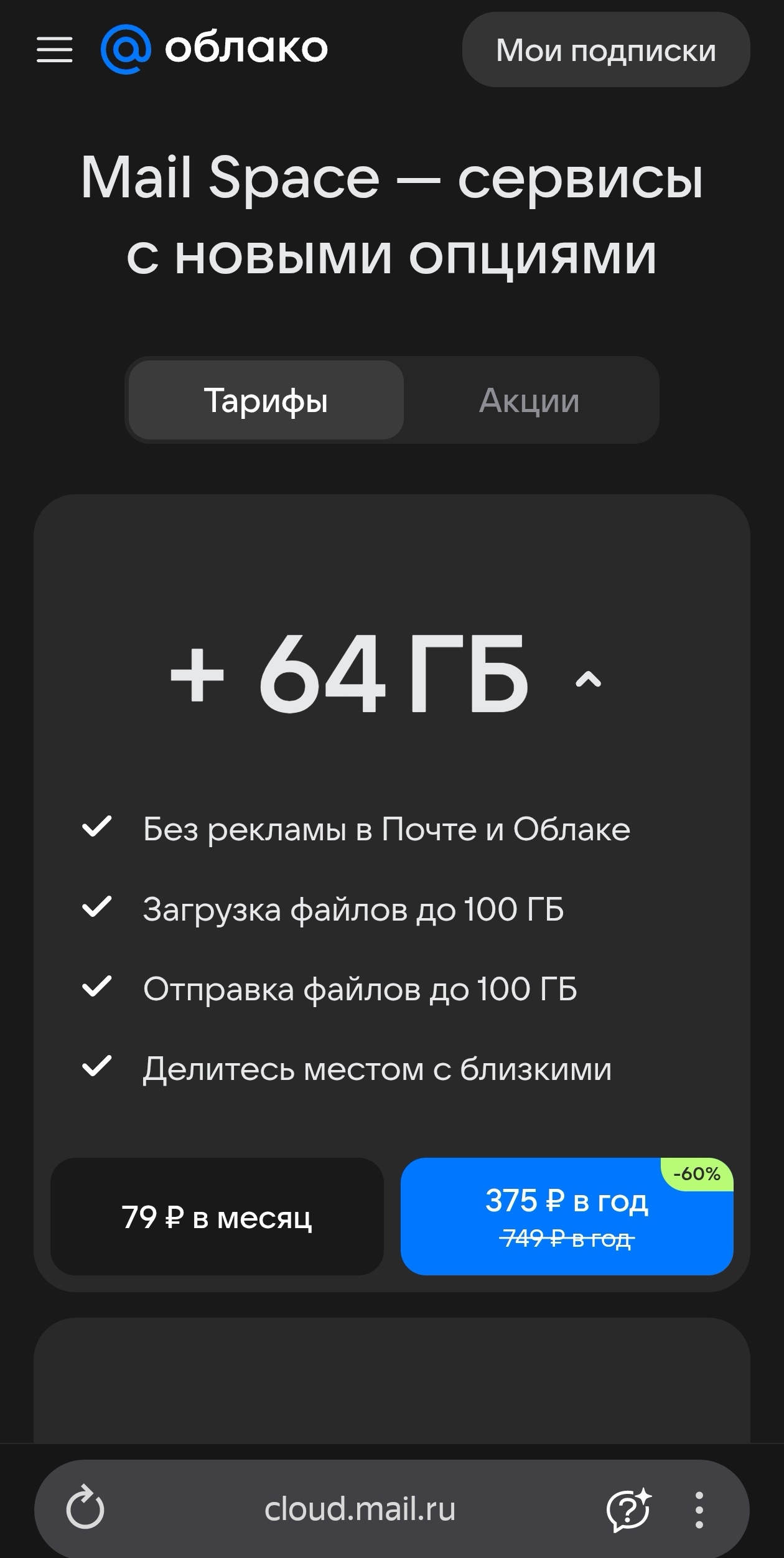 Недавно оформил подписку на Mail.ru.Хоть и пользуюсь почтой/облаком довольно редко, но реклама достала, да и цена на год заманчиво-смешная.