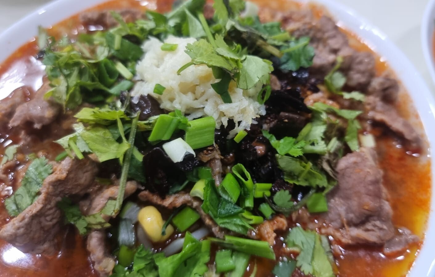 Тут, как кому сколько нравится. Затем выкладываем говядину. Заливаем бульоном и сверху кладём нашу "МА ЛА посыпку". Тут тоже по своему вкусу. Затем берём измельчённый чеснок и кладём сверху.