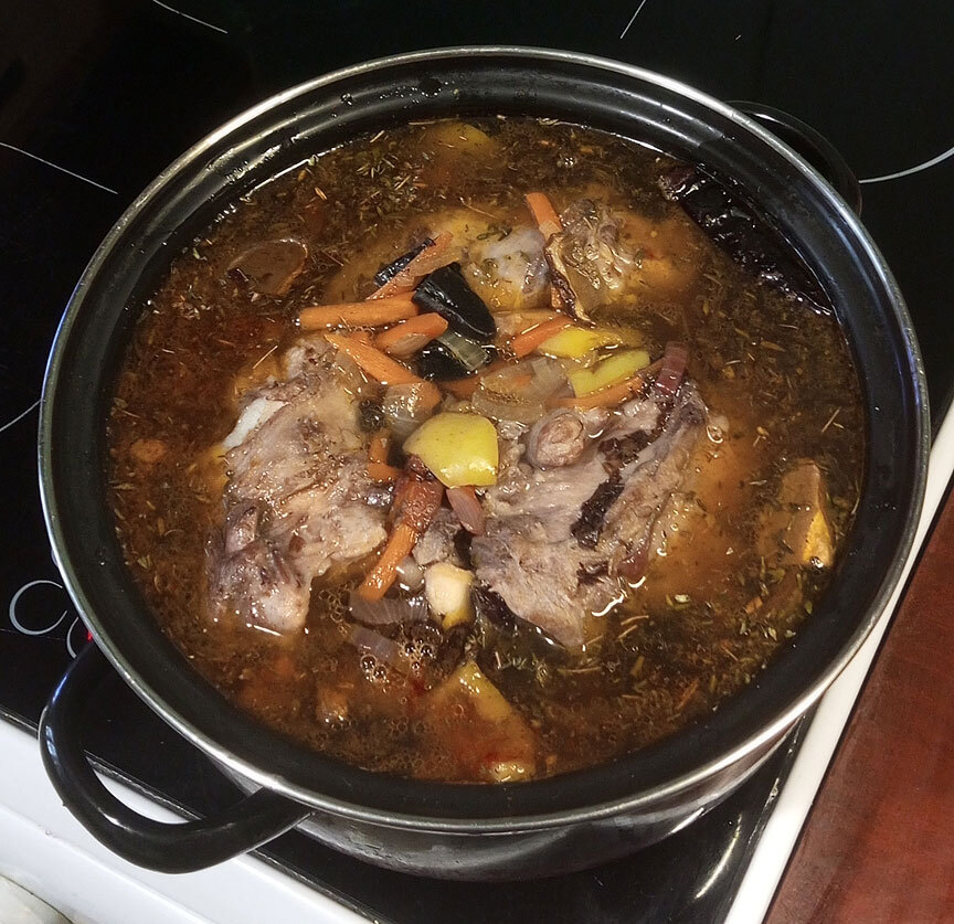 Посыпаем чайной ложкой тимьяна, столовой ложкой (без горки) молотой паприки и столовой ложкой соли с горкой (примерно 25 граммов помола №1). Заливаем половину объема кастрюли горячим грибным настоем, остаток объема «добиваем» бульоном, сваренным заранее из говяжьей косточки (у нас на рынке их отдают бесплатно).