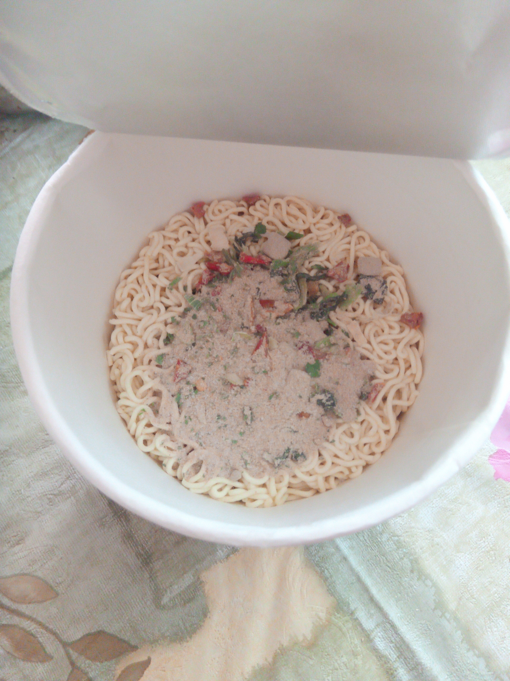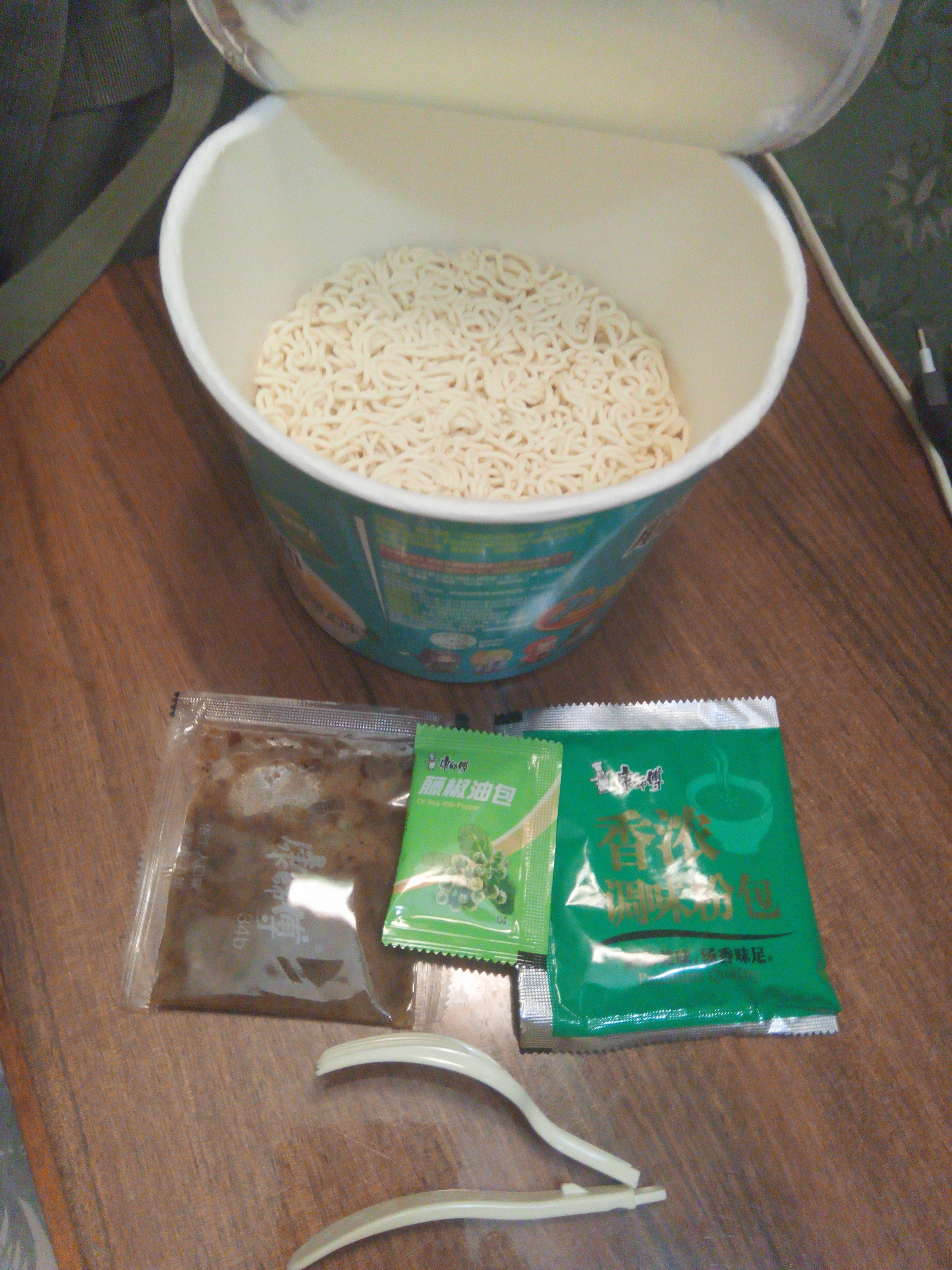 Внутри мы видим лапшу, вилку, пакетик с сухими приправами, основу для бульона и пакетик с перечным маслом. Завариваем все это.