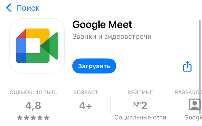 Приложение для звонков и видеовстреч Google Meet заняло второе место в списке самых скачиваемых бесплатных приложений для общения в российском App Store, убедился корреспондент ТАСС. Первое место занимает мессенджер Max.