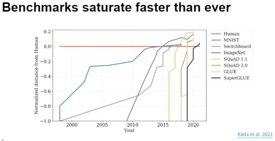 В начале 2000-х и 2010-х годов после создания набора данных требовалось 5+ лет, чтобы «роботы» смогли достичь планки, заданной человеком. К концу прошлого десятилетия некоторые бенчмарки, которые специально создавались с пониманием, что они непосильны нейронкам, закрывались менее чем за год. Обратите внимание на график выше: линии становятся всё вертикальнее и вертикальнее – то есть уменьшается интервал с публикации метода оценки способностей до того момента, когда модели достигают результата на уровне человека.