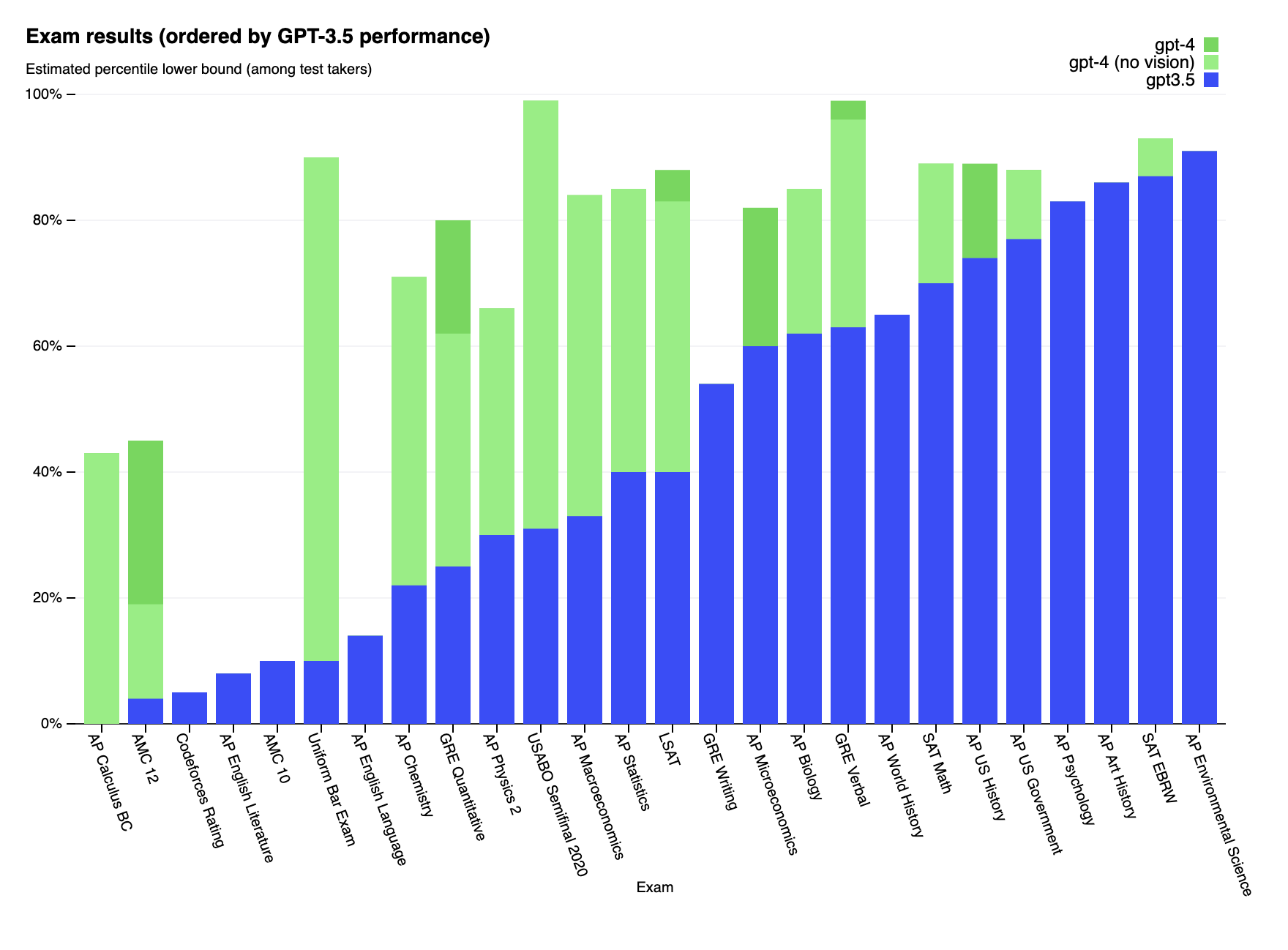 По вертикали – процент людей, сдававших тот или иной экзамен хуже, чем GPT-4 (зелёный) / GPT-3.5 (синий столбик). Чем выше столбик – тем «умнее» модель по сравнению с человеком