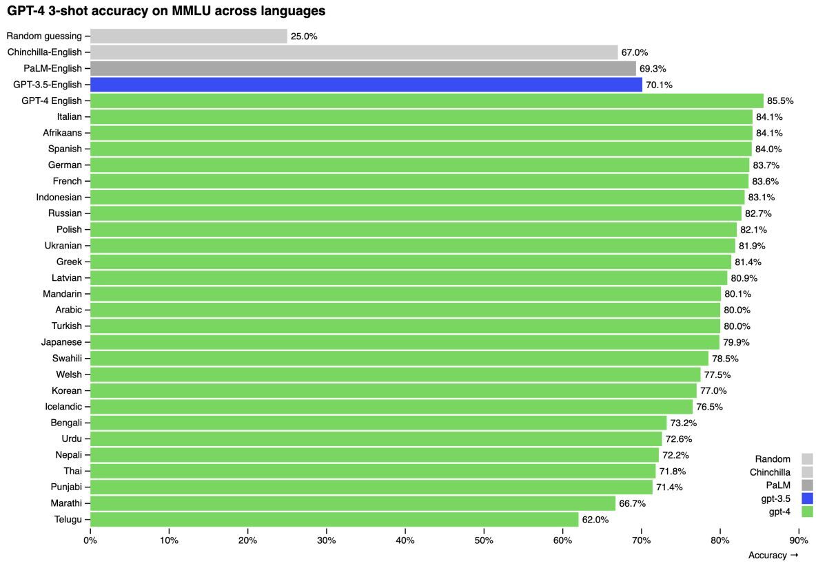 До релиза GPT-4 лучший показатель был у модели Google – 69%, nice! Но просто побить этот результат для команды OpenAI – это такое себе достижение (можно сказать, это было бы ожидаемо). И они решили добавить в это «уравнение» еще одну переменную – язык.