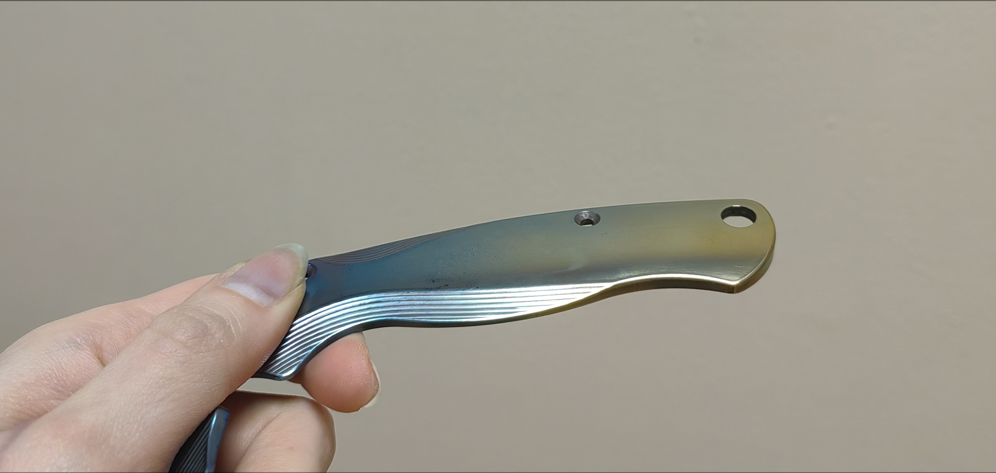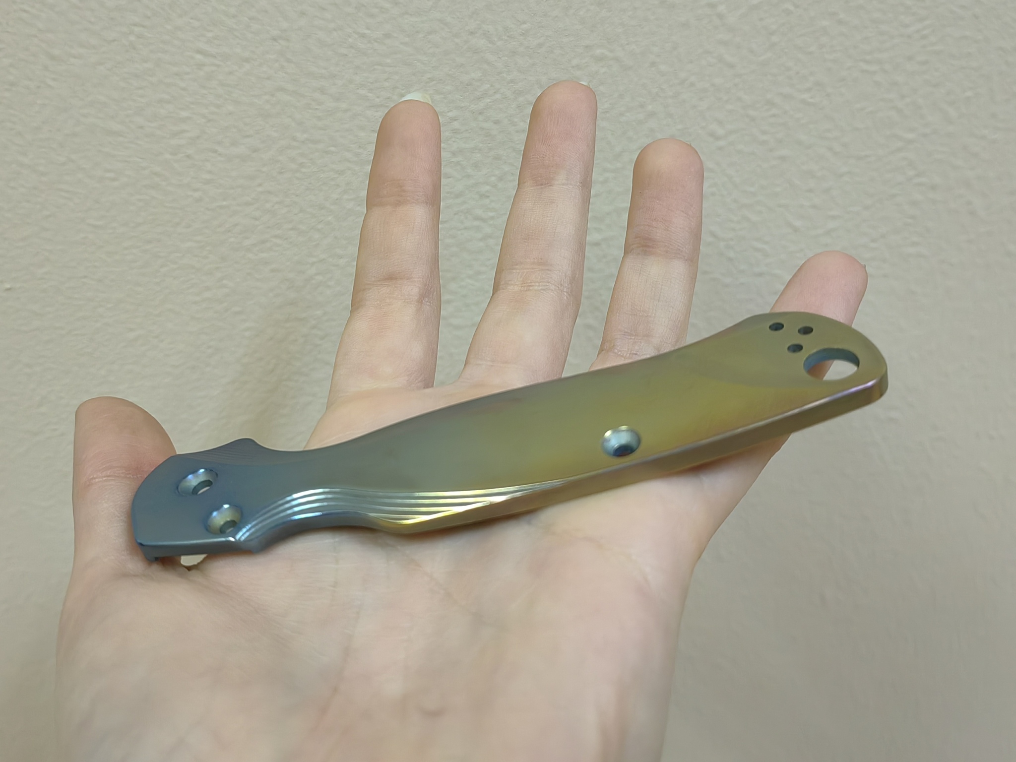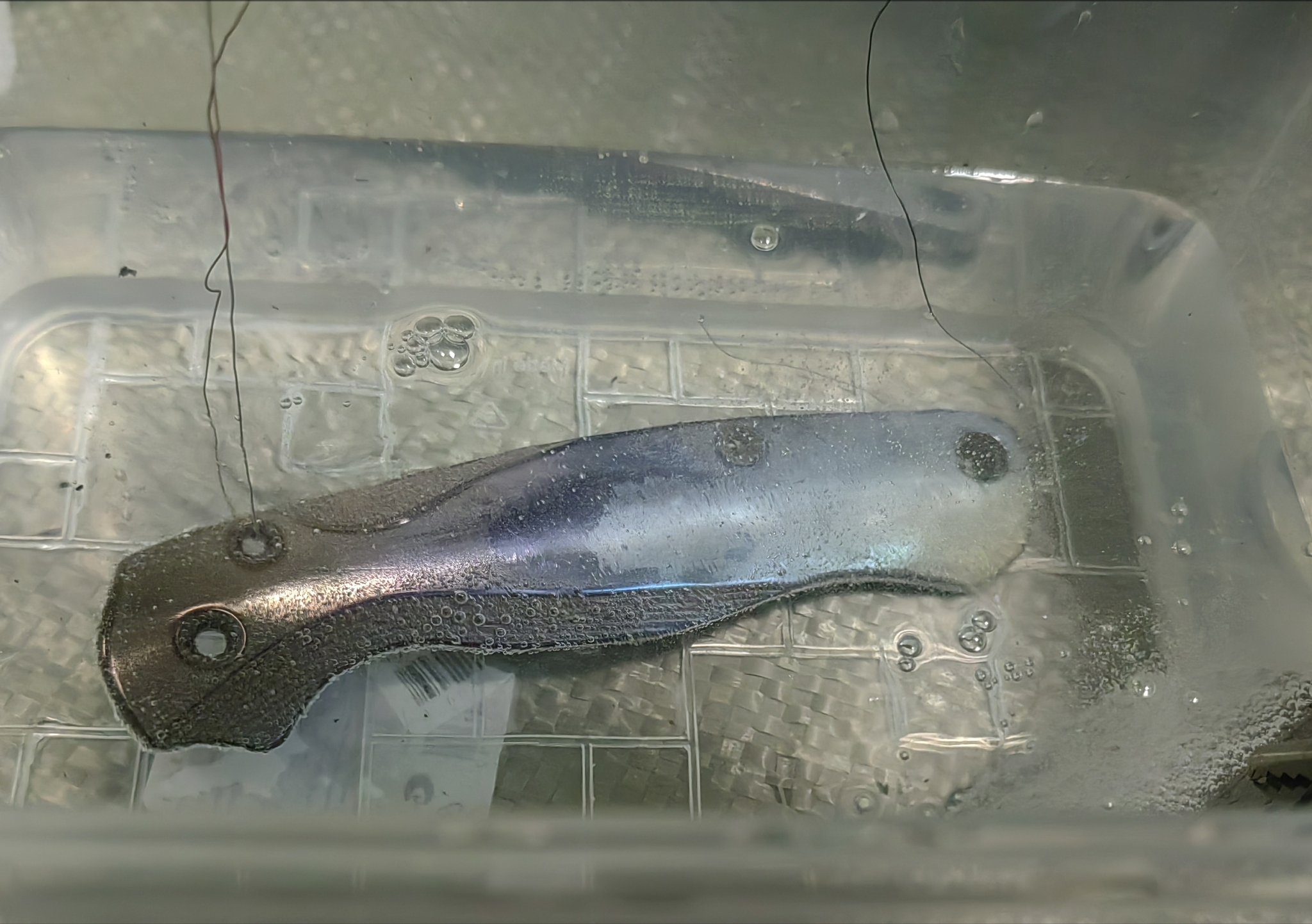 Накладки были подключены к аноду с помощью титановой проволоки. В качестве катода была выбрана деталь из нержавеющей стали марки 304. Анодирование проводилось с постепенным увеличением вольтажа, что позволило создать градиентный эффект.