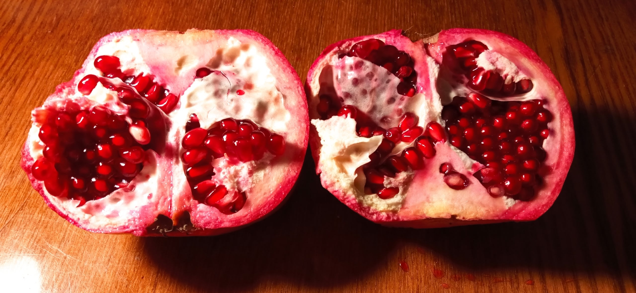 Мало того что добыть гранат нелегко — ветки колючие, так и до зерен не доберешься. Удар ножом по плотной кожуре неизбежно вызовет фонтан сока. Специалисты предлагают три способа очистки. Можно аккуратно срезать верхушку с коронкой, не задевая зерен, и разрезать плод на шесть долек, как апельсин. Второй способ предлагает опять-таки срезать верхушку, затем надрезать кожуру (только кожуру) по окружности плода, вырезать на «полюсах» граната мягкие утолщения кожи, и только потом разломить гранат руками на половинки. Наконец, третий способ: плод со срезанной верхушкой и надрезанной кожурой замочите пять минут в миске с холодной водой, а затем, держа плод под водой, аккуратно разломайте его на кусочки. Кожура и пленки всплывут, а семена сами упадут на дно. Тут вы их и подберете.
