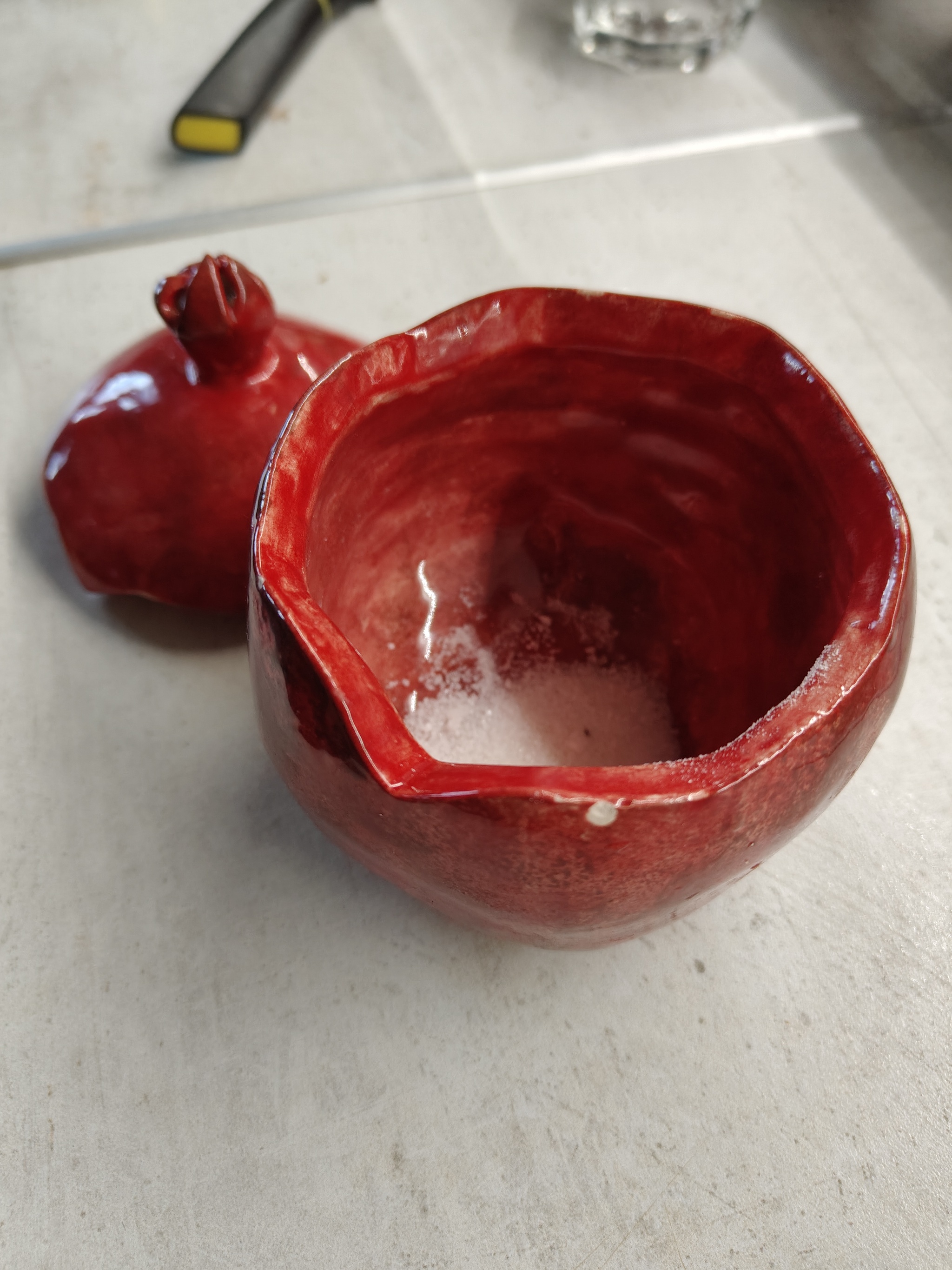 Также у меня почему-то сильно по цветовым тонам отличается само изделие и крышка. Тут сходу не готова посыпать голову пеплом. Покрывала всё на одном занятии из одной баночки. Предполагаю, что сильно в разные места в печи положили крышку и сам гранат, а печь уже не новая и есть ощутимая разница в температуре внутри печи. Отсюда глазурь по разному итогово выглядит.