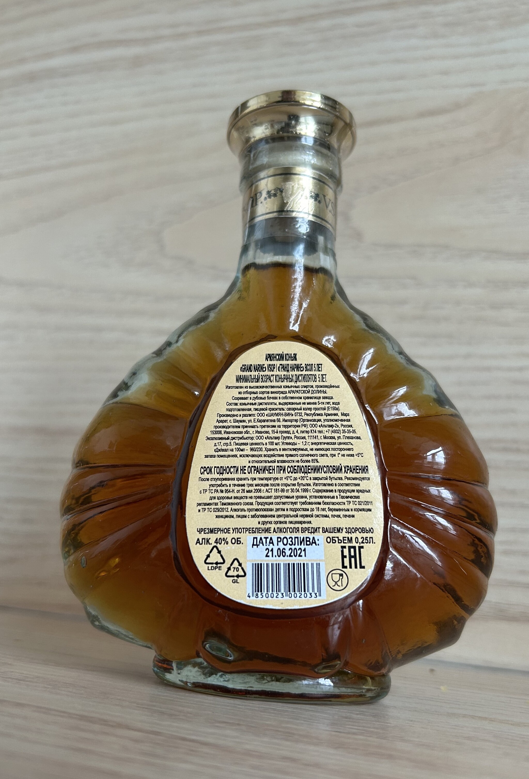 Анализируем данные с контрэтикетки. Там указаны отборные сорта винограда с Араратской долины, спирты, которые прожили в собственных бочках завода не менее пяти лет, вода и сахарный колер У меня на тесте коньяк производства 21 июня 2021 года, и где он так долго прятался и не запылился.