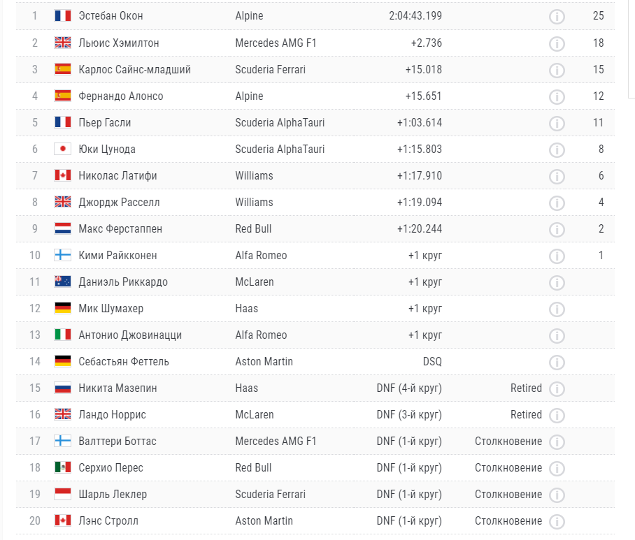 Таким образом, Льюис Хэмилтон набрал ещё больше очков, укрепив вернувшееся к нему лидерство в зачёте пилотов, а Сайнс стал третьим.