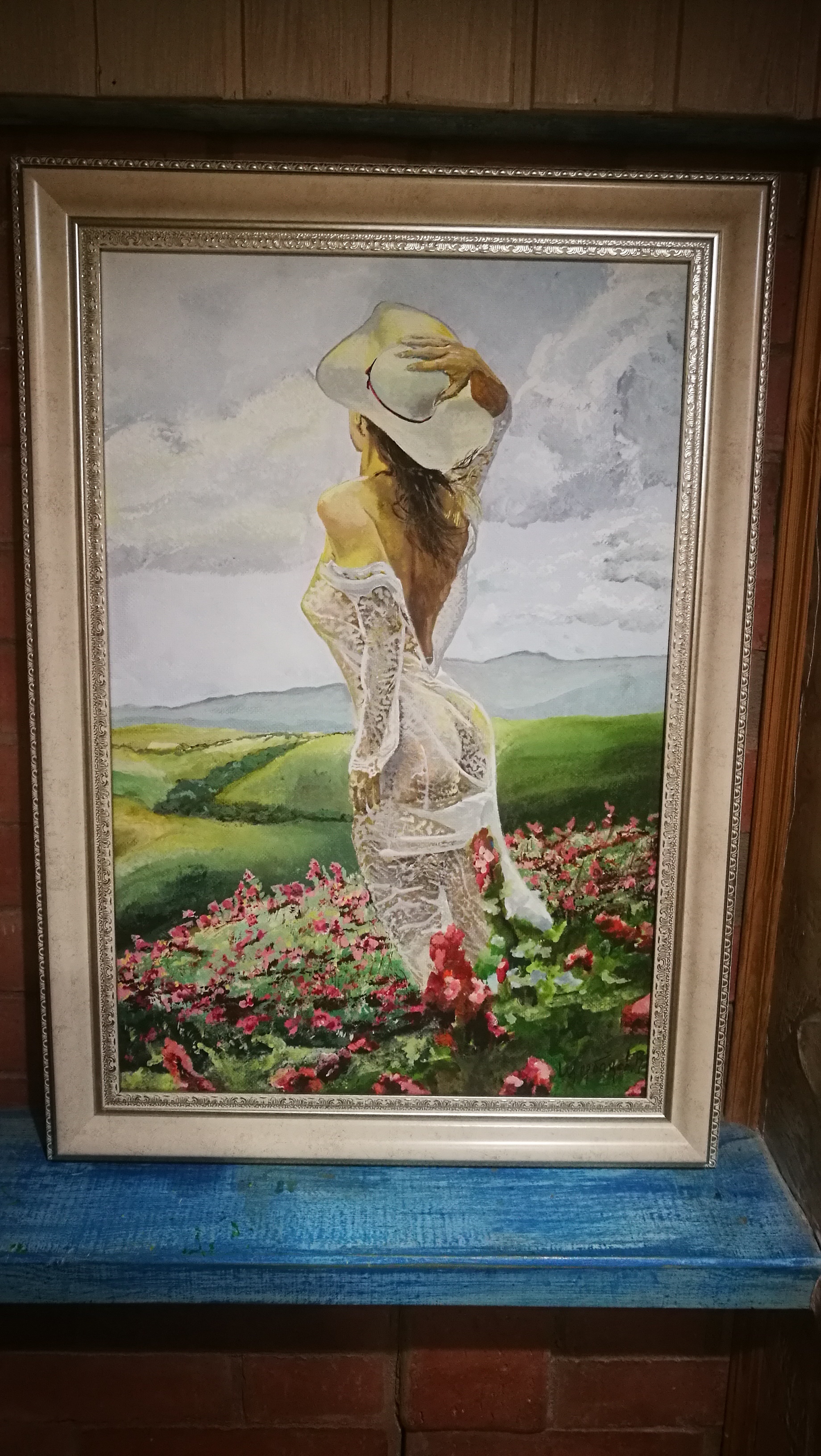 Сюжет картины такой) Холмы и предгорья Италии. Лёгкий ветерок, присущий для таких мест, наполняет тело прохладой в знойный летний день. Дышится легко, пахнет травами и цветами. Свобода, грация, устремленность в прекрасное будущее выражается в тонких очертания женской фигуры.