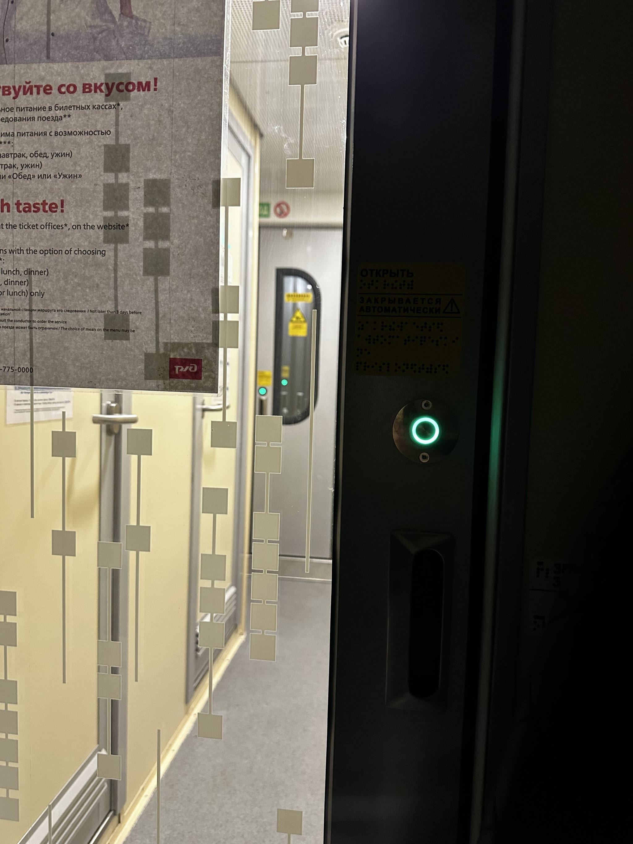 Вход в зону туалетов и тамбура - на фото. Наблюдаю, как для процентов 20 наших граждан нажатие зеленой кнопки является непосильной интеллектуальной задачей. Они буквально выдирают дверь, ломят ее, тащат изо всех сил. Закрывается она тоже сама. Но граждане, успешно справившись с пунктом один, начинают столь же яростно её закрывать.