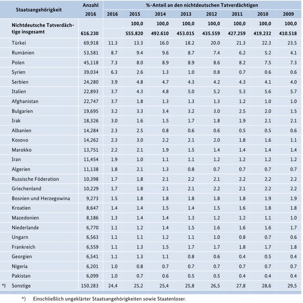Всего в Германии за прошлый год было поймано 2.360.806 преступников. За вычетом нарушения визового режима получается 2.022.414. Из них 616.230 (30,5%) иностранцы (см. стр. 46). Нужно заметить, что с каждым годом количество иностранных преступников растет, а местные всё меньше нарушают закон.