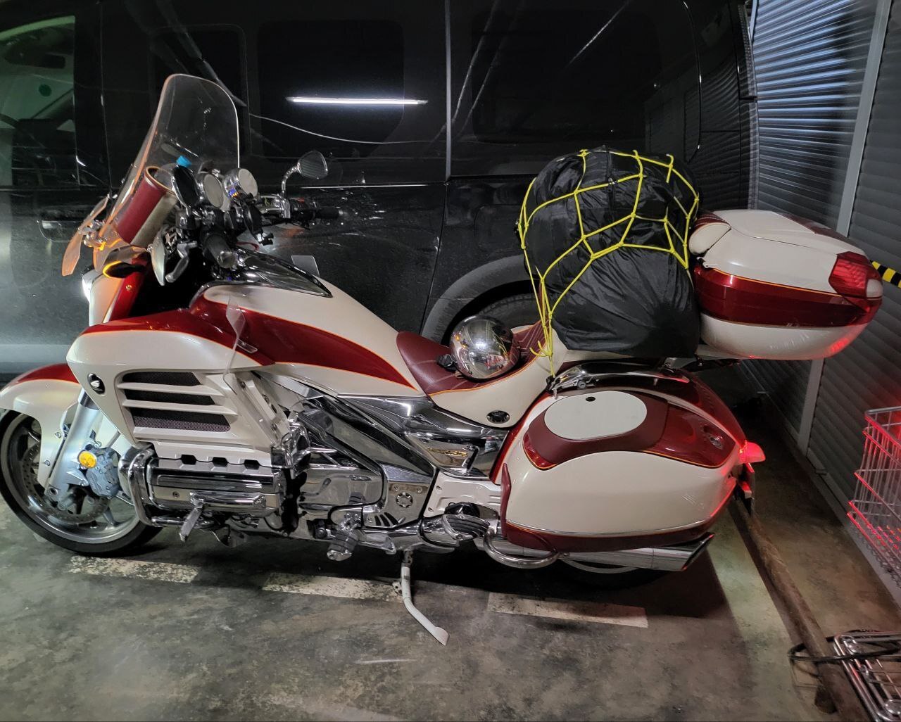 Помимо в цилиндров и кофров, что не выглядят съёмными, на себя обращает внимание и передняя подвеска. Это не телескопическая вилка, вероятно стоит ожидать что-то сродни BMW evo duolever или похожей конструкции вилки из уже последнего поколения Gold Wing.