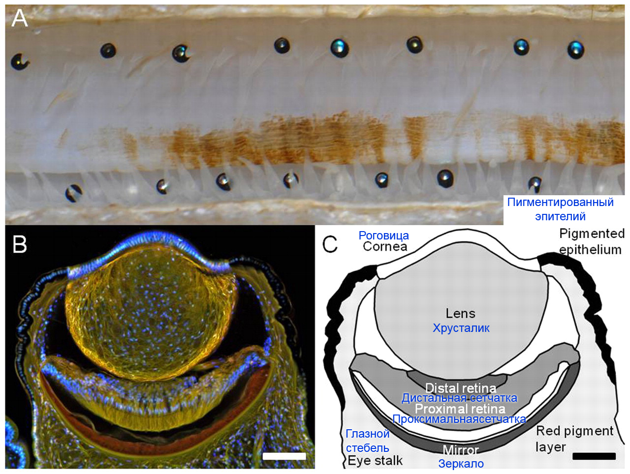 В глазах гребешка есть хрусталик, два слоя сетчатки и вогнутая светоотражающая поверхность, так называемые «зеркала».