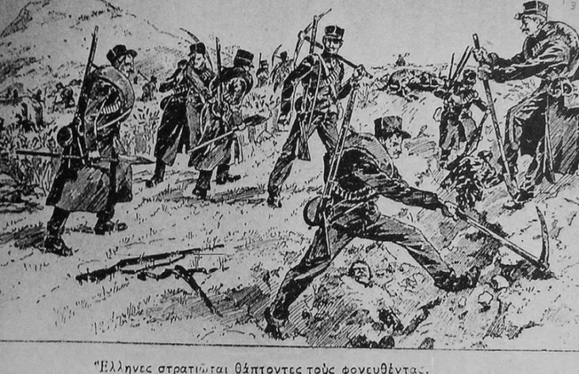 Греческие солдаты наскоро хоронят убитых и собирают оружие на поле сражения:
