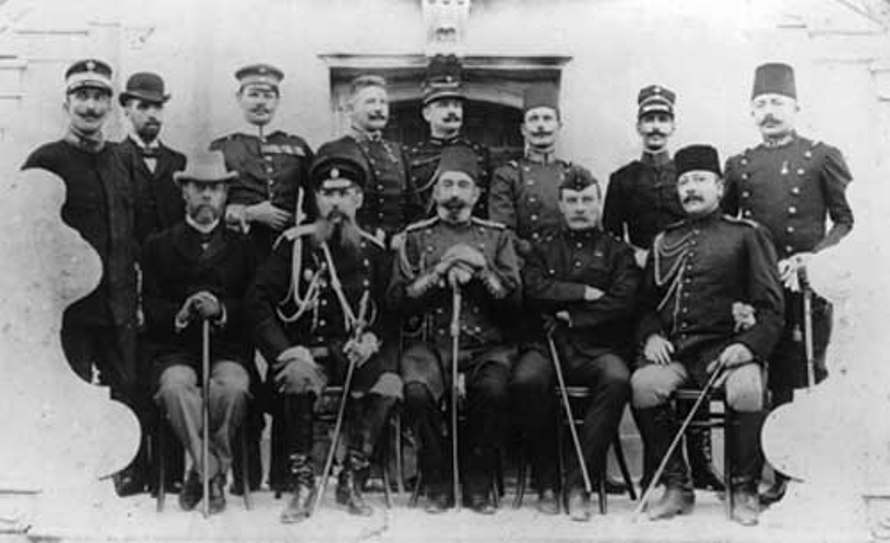 Иностранные военные агенты (представители) при штабе Эдхем-паши с интересом наблюдали за кровавыми играми на задворках Европы. В их веселой кампании легко опознаваемы российский офицер с роскошными бакенбардами-подусниками и британец в характерной пилотке (сидят в первом ряду), итальянцы в своих высоких кепи (по краям во втором ряду) и, конечно же, "фриц" в плоской фуражке и с подкрученными усами (третий слева, второй ряд):