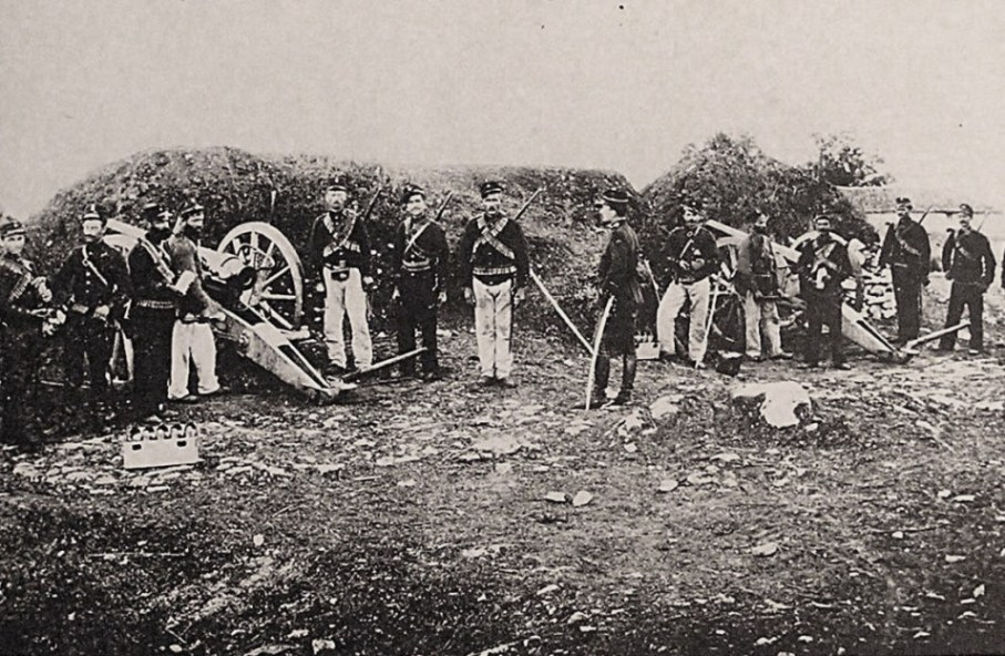 Бойцы в красных блузах на переднем плане - европейские волонтеры-гарибальдийцы, сражавшиеся за греков. Симпатии европейской общественности традиционно были на стороне гордых эллинов, хотя о позиции "великих держав" так однозначно не скажешь.
