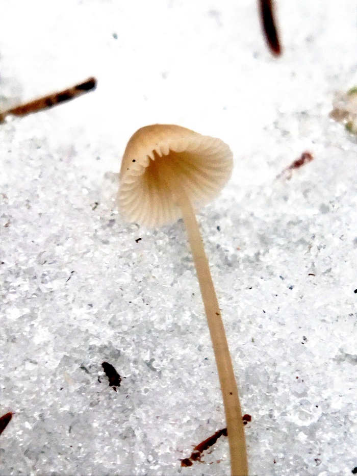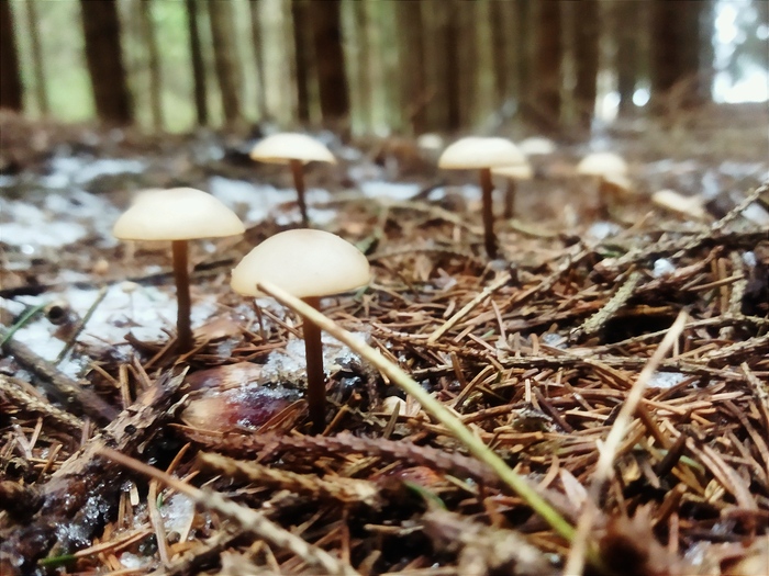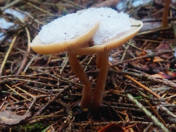 Мицены присыпало снегом. Но в хвойном опаде тепло и они ещё чувствуют себя вполне уютно. Там же прячутся и рядовки.