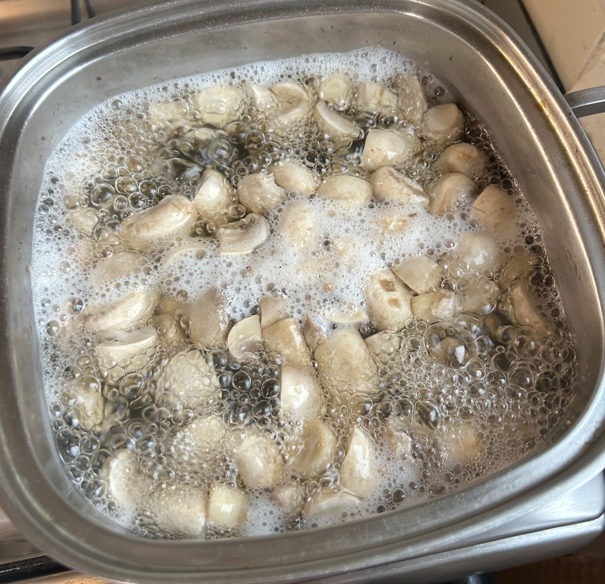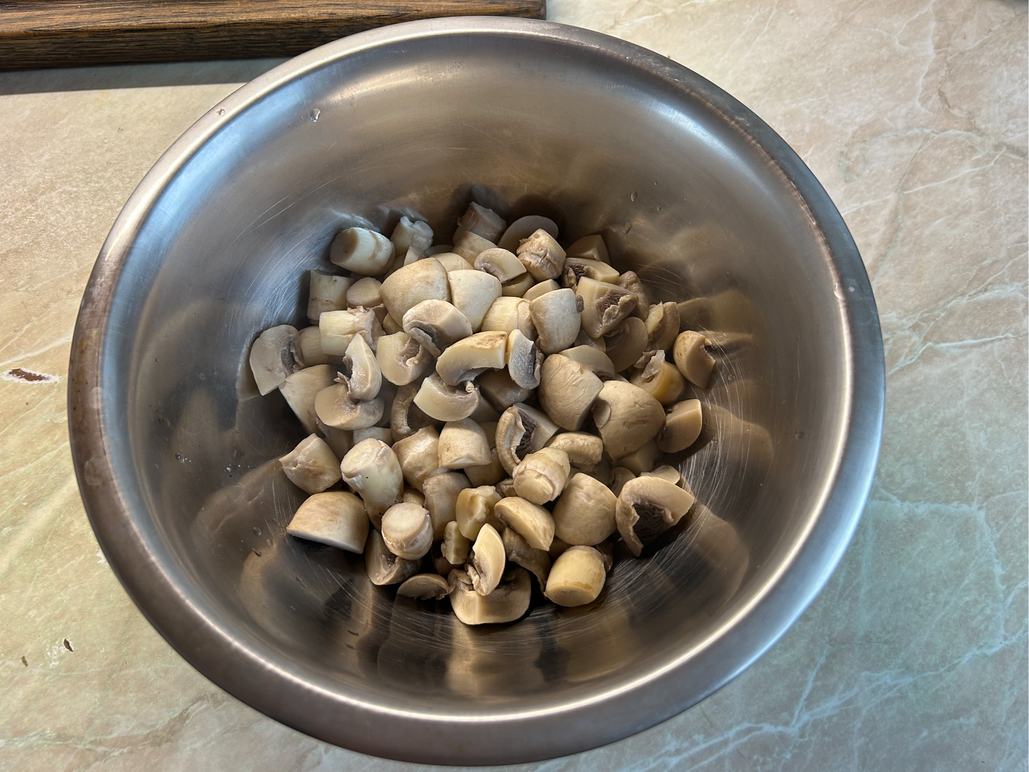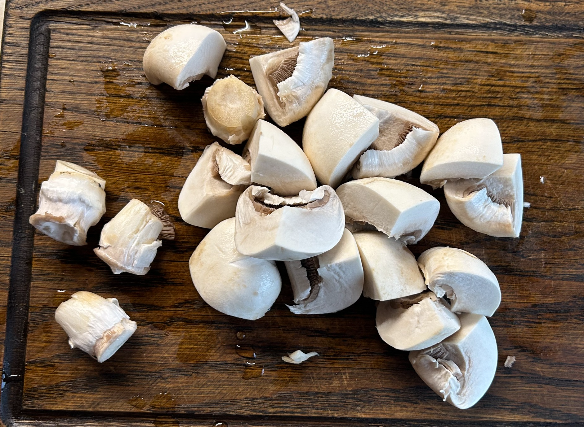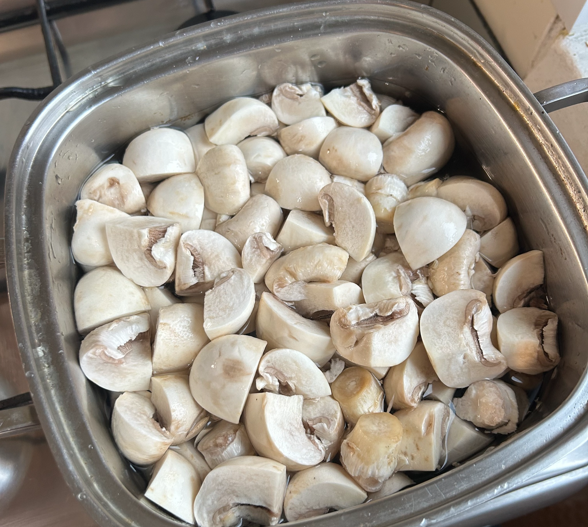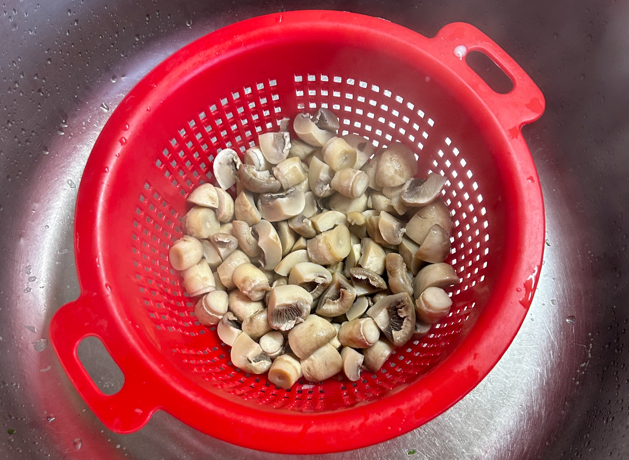 Берем наши грибы, чистим от грязи, промываем в дуршлаге, и нарезаем их равными кусками, в грибах такого размера я обычно отламываю ножку а шляпку делю на 4 куска, получается отлично.
