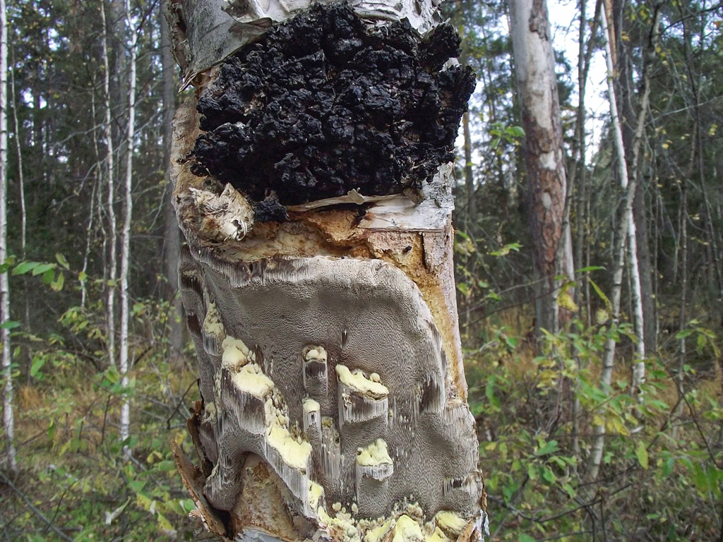 В экспозиции нашего Ботанического музея можно увидеть крупный черный нарост неправильной формы на стволе березы. Это чага. Она образуется в результате заражения дерева трутовиком скошенным (Inonotus obliquus), который относится к группе базидиомицетов. Споры этого гриба проникают в дерево через различные повреждения коры и вызывают развитие белой сердцевинной гнили.